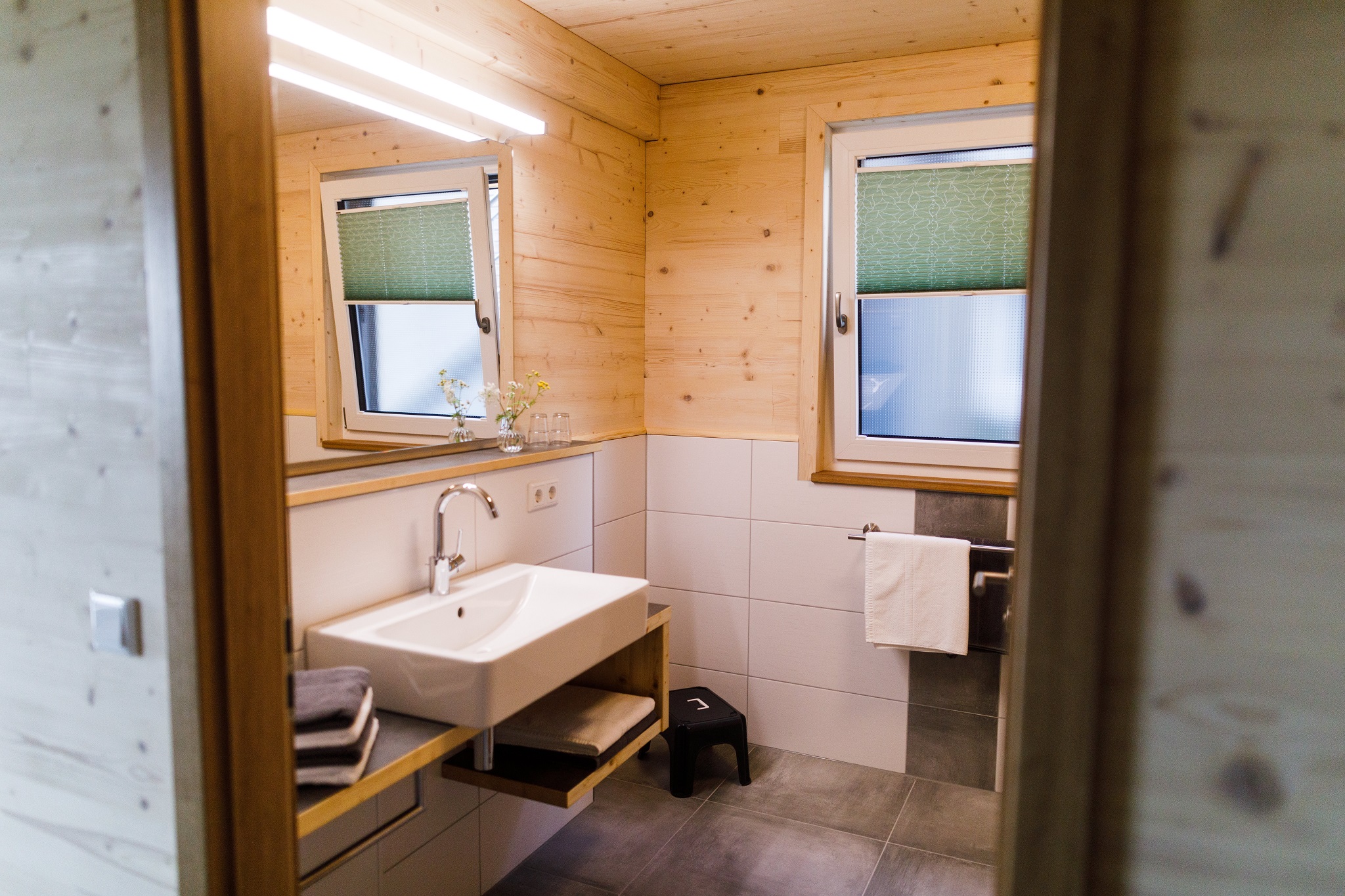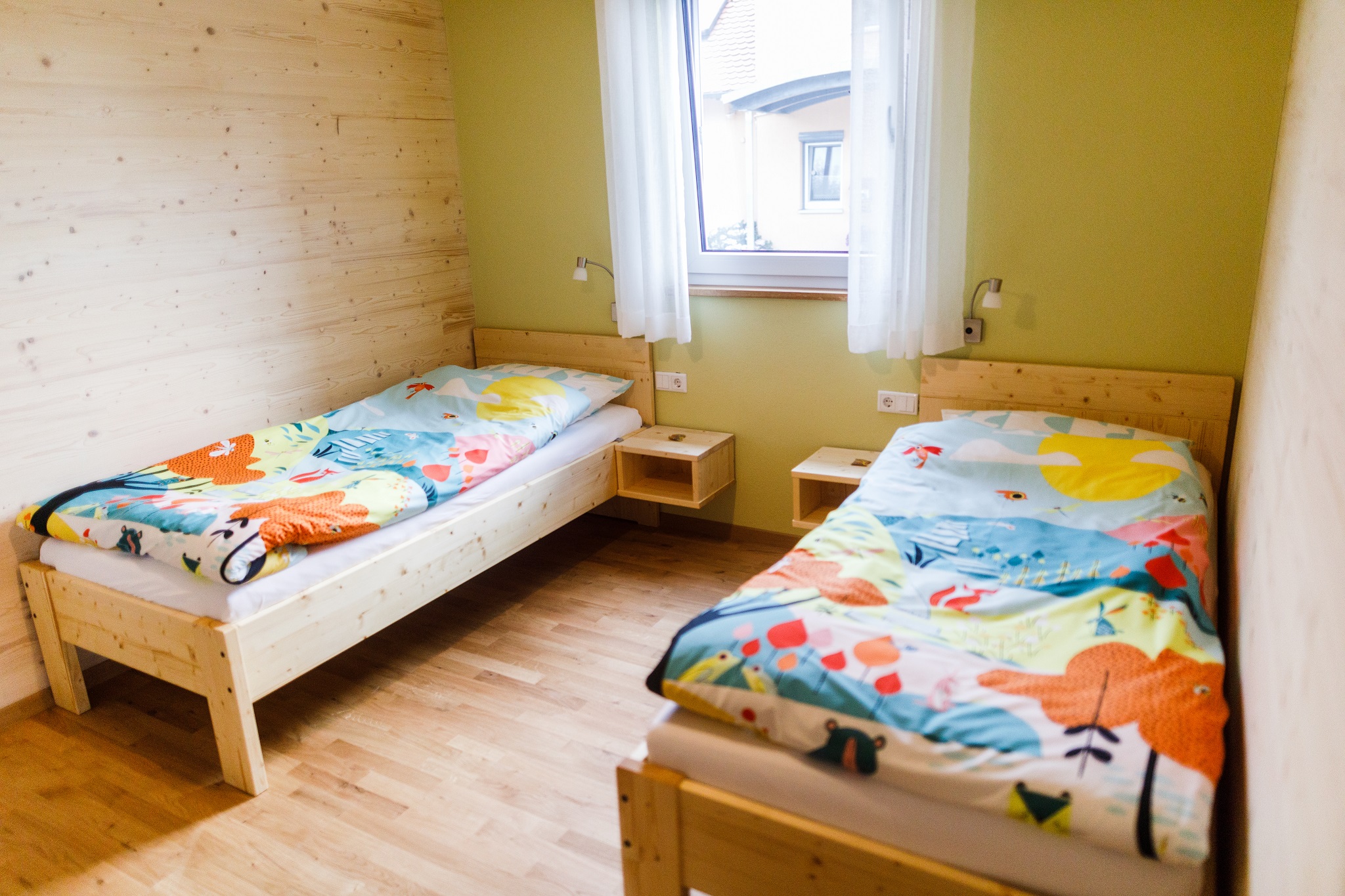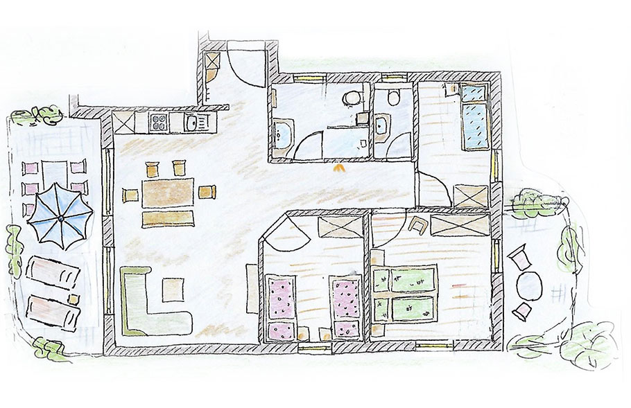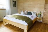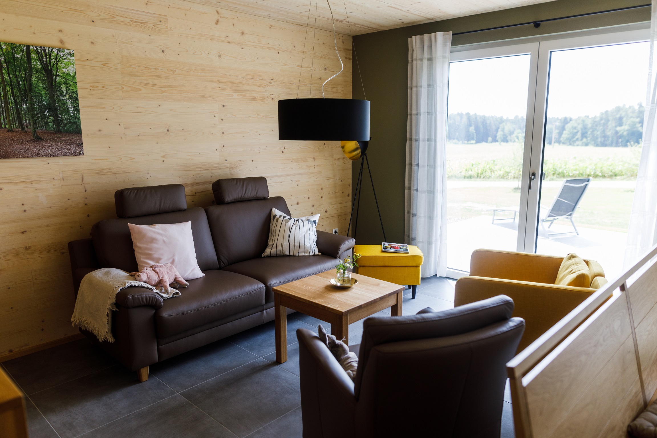 Waldblick - die ebenerdige 86 m² große Komfort-Ferienwohnung liegt im Erdgeschoß von Haus 1 und ist teilweise barrierefrei. Wir verwendeten bei der Bauphase und Ausstattung ausschließlich ökologische, natürliche Produkte. Daher ist die Wohnung sehr gut für Allergiker geeignet. Sie verfügt über eine große Süd/West-Terrasse mit freiem Blick über Wiesen und Äcker bis hin zum Mönchswald. Ein weiterer kleiner Außenbereich ist vom Elternschlafzimmer erreichbar. Beide Terrassen sind mit einer Sitzgruppe und einem Sonnenschirm ausgestattet.