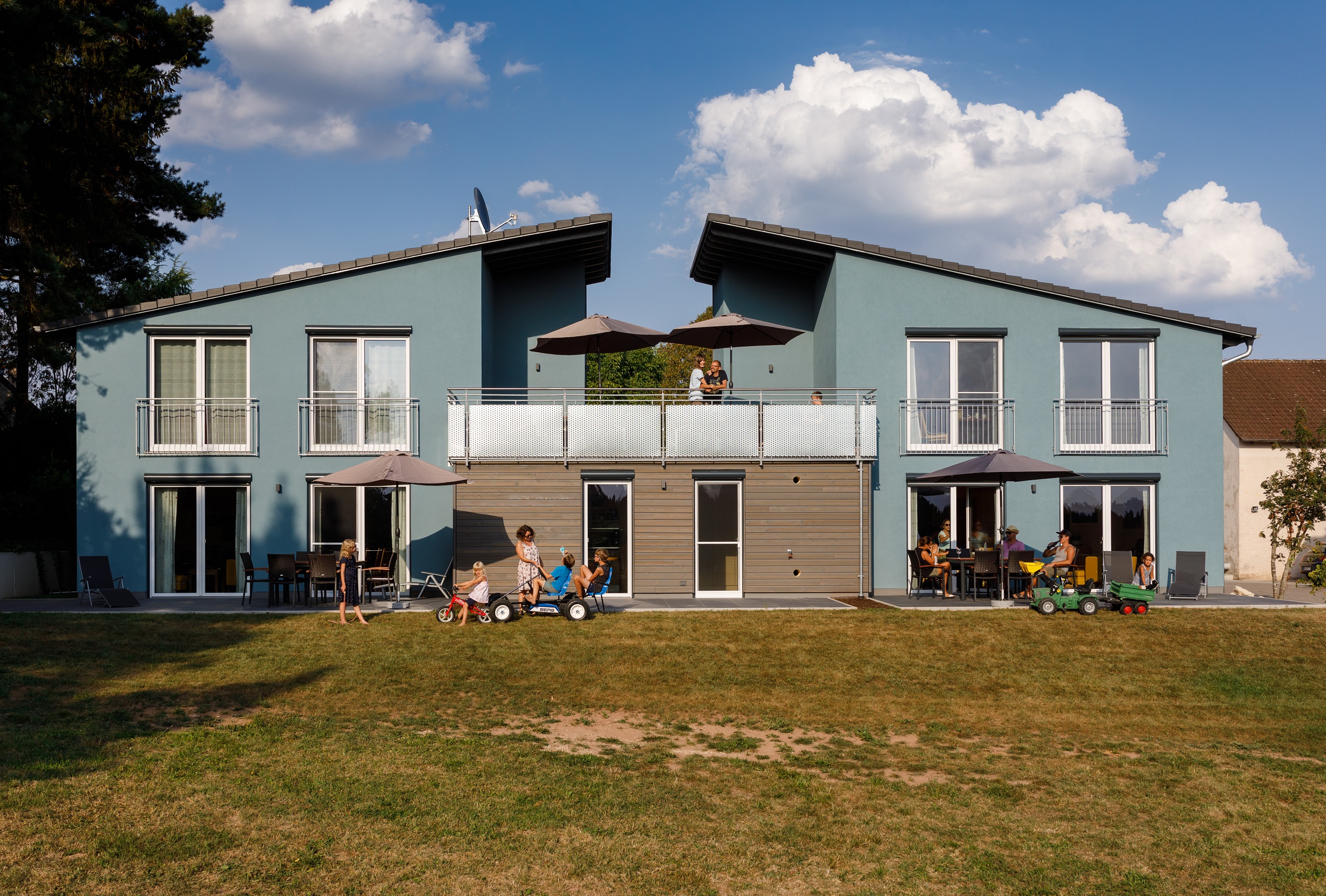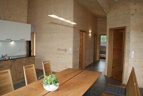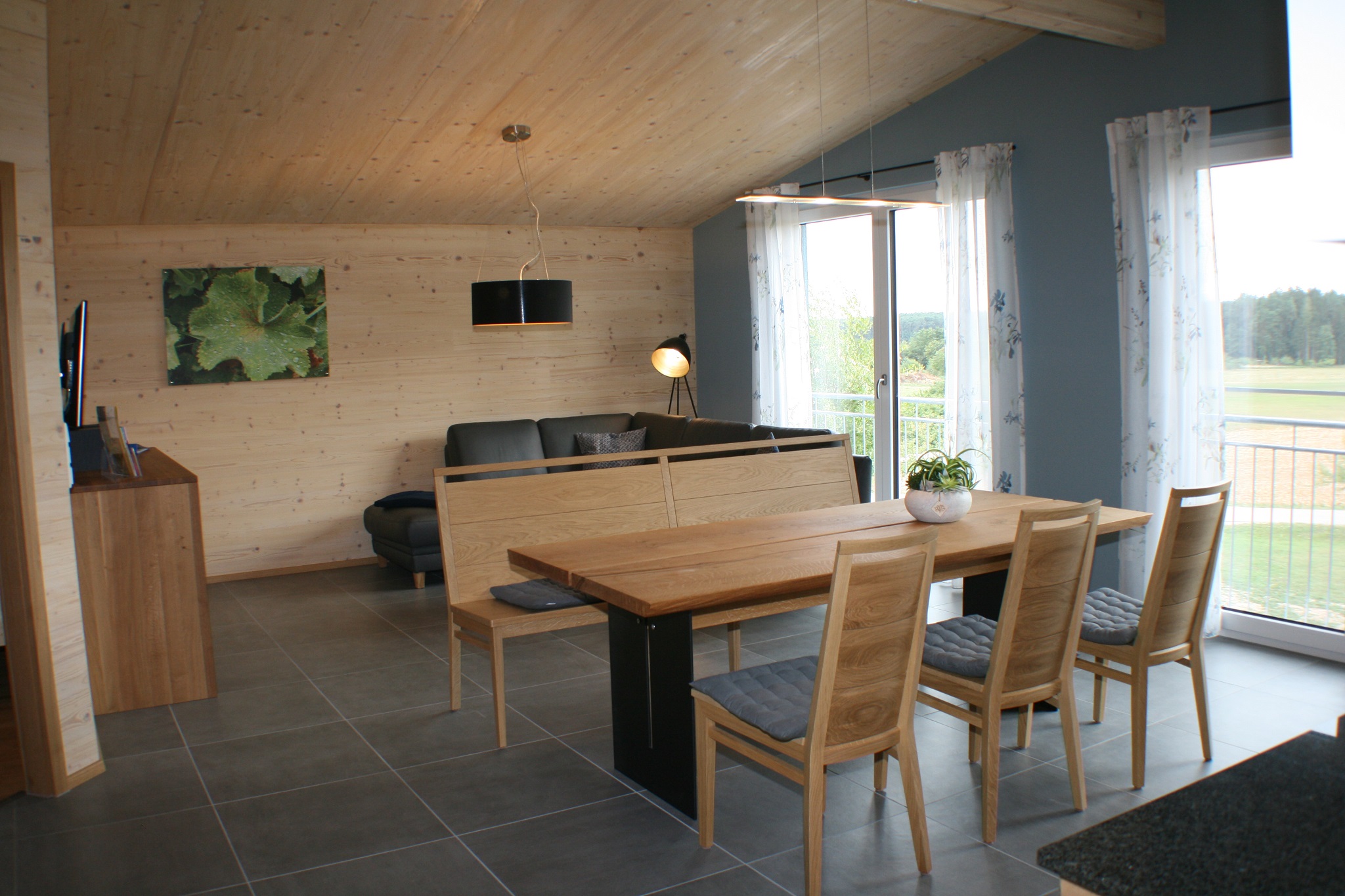 Morgentau - die 86 m² große Komfort-Ferienwohnung liegt im Obergeschoß von Haus 1 und ist über eine außenliegende Treppe gut erreichbar. Die besondere offene Bauart, sorgt für ein luftiges Raumgefühl und verleiht der Wohnung einen großzügigen, ausgeglichenen Charakter. Wir verwendeten bei der Bauphase und Ausstattung ausschließlich ökologische, natürliche Produkte. Daher ist die Wohnung sehr gut für Allergiker geeignet. Sie verfügt über eine große Süd/West-Terrasse mit freiem Blick über Wiesen und Äcker bis hin zum Mönchswald und Haundorfer Weiher. Ausgestattet mit einer Sitzgruppe und Sonnenschirm.
