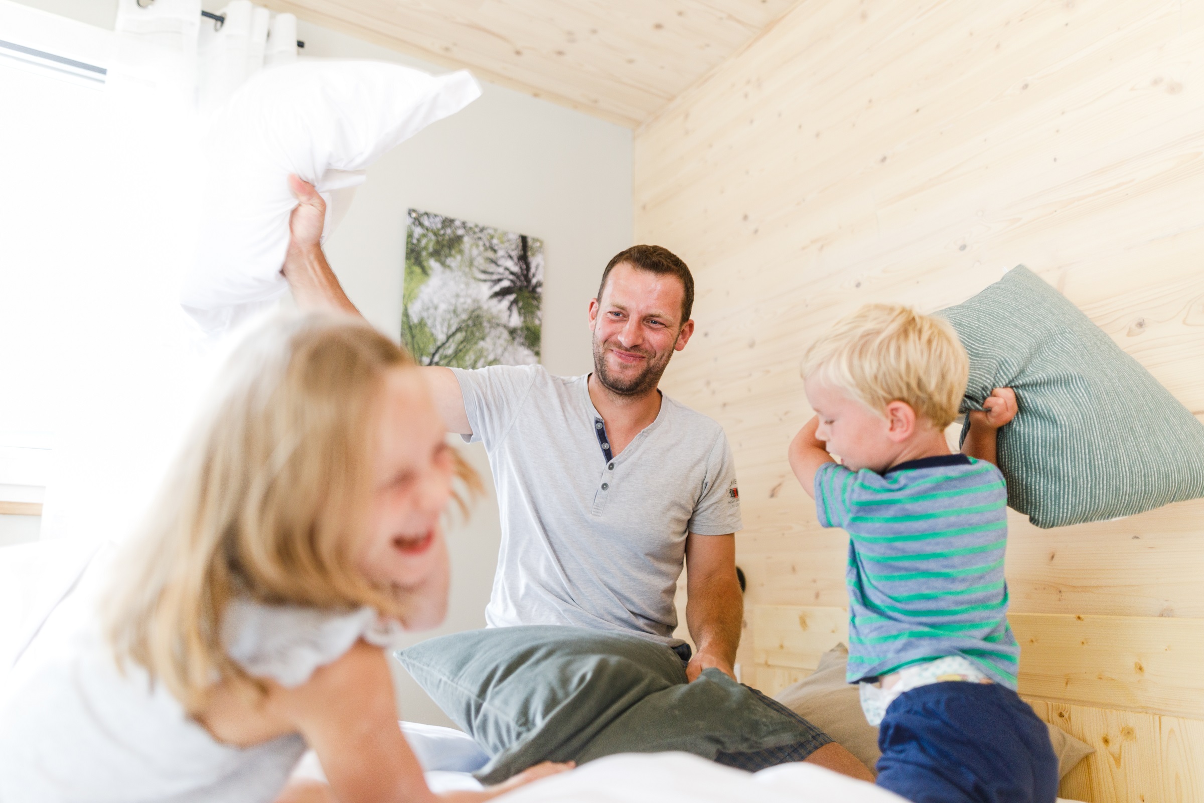 Fühlt euch in unseren modernen und familienfreundlichen Ferienwohnungen, wie zu Hause. Jede Wohnung verfügt über drei Schlafzimmer, einem großzügigen Küchen-/Wohnraum und einem hellen Badezimmer mit ebenerdiger Dusche. In jedem Detail familientauglich: Eine umfangreiche, kindgerechte Ausstattung und durchdachte Sicherheitslösungen, wie kindersichere Steckdosen, elektrische Rollladen und Insektenschutzgitter sorgen dafür, dass sich eure Kleinen rundum wohlfühlen. Da macht der Aufenthalt selbst bei schlechtem Wetter richtig gute Laune!