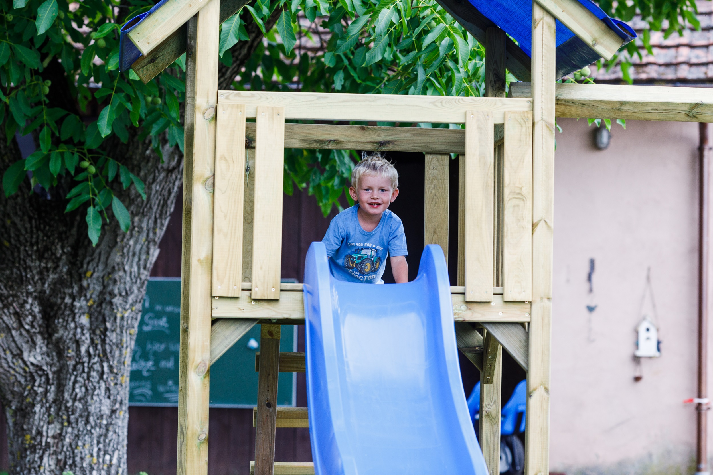 Der einsehbare Spielplatz im Herzen unseres Ferienhofes ist für jedes Kind ein Paradies. Ob in der gemütlichen Vogelnestschaukel, beim Springen auf dem riesigen XXL-Trampolin, auf der Rutsche oder im großen, unter dem Nussbaum liegenden, Sandkasten mit Matschküche, hier sind unbeschwerte Kindheitsmomente garantiert. Für kühle Erfrischungen und fröhliches Planschen lädt unser kleiner Wasserlauf ein und richtig viel Platz zum Toben gibt's auf unserer großen Wiese! Hier werden spontane Fußball-Turniere zwischen den Familien organisiert oder beim Federball um jeden Punkt gekämpft. Zusätzlich wartet eine große Auswahl an Fahrzeugen, vom Bobby-Car für die Kleinsten bis hin zum großen Berg-Kettcar für die ganze Familie. Und sollte das Wetter mal nicht mitspielen, sorgt unsere große Auswahl an Würfel-, Karten- und Brettspielen für lustige Stunden!
