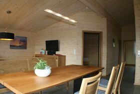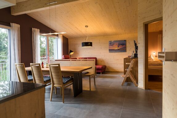 Abendrot - die 86 m² große Komfort-Ferienwohnung liegt im Obergeschoß von Haus 2 und ist über eine außenliegende Treppe gut erreichbar. Die besondere offene Bauart, sorgt für ein luftiges Raumgefühl und verleiht der Wohnung einen großzügigen, ausgeglichenen Charakter. Wir verwendeten bei der Bauphase und Ausstattung ausschließlich ökologische, natürliche Produkte. Daher ist die Wohnung sehr gut für Allergiker geeignet. Sie verfügt über eine große Süd/West-Terrasse mit freiem Blick über Wiesen und Äcker bis hin zum Mönchswald. Ausgestattet mit einer Sitzgruppe und Sonnenschirm.