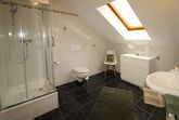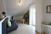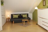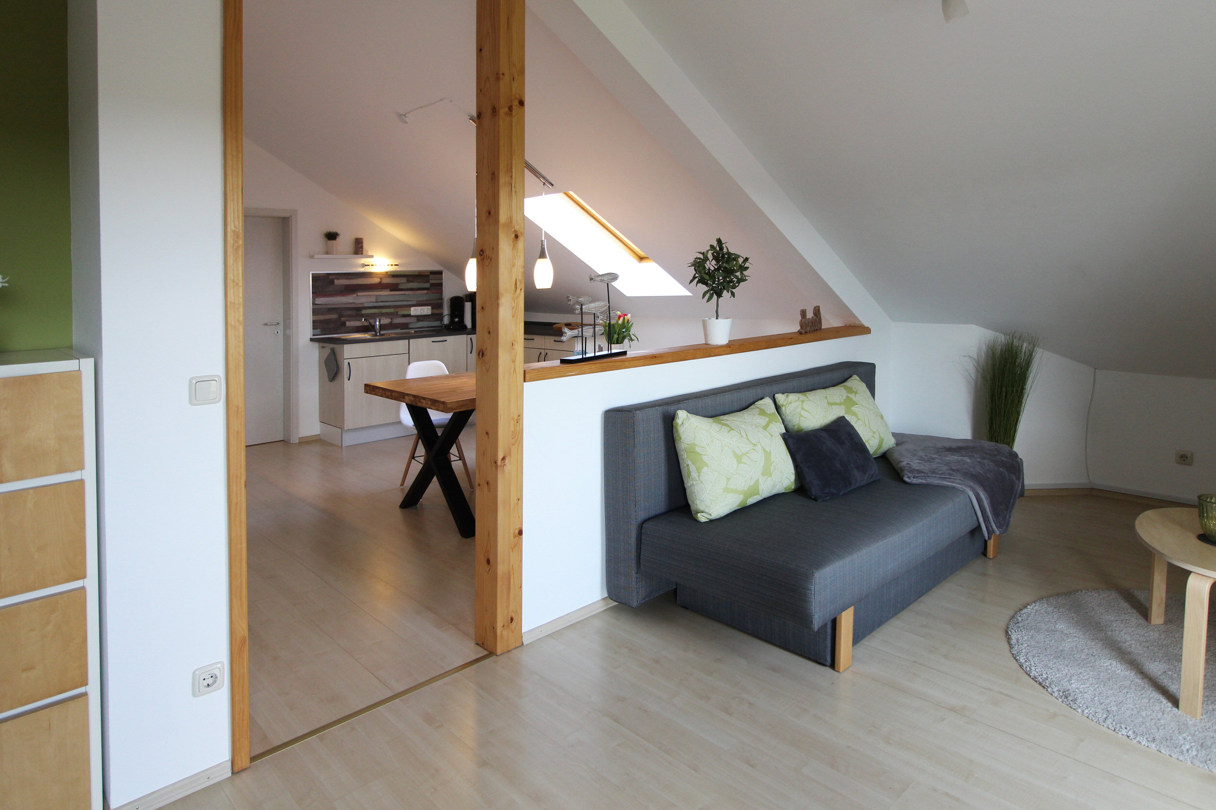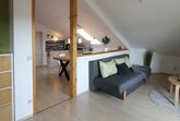Die gemütlichen hohen Räume mit Dachschrägen laden mit einer Wohnküche und großzügigem Essbereich zum Beisammensein ein. Der Wohnbereich besteht aus 2 Bereichen. Einmal ein Fernsehbereich mit Sofa, TV-DVD/Blue Ray und einem separaten Bereich ebenfalls mit Sofa als gemütliche Lese- und Spielecke.