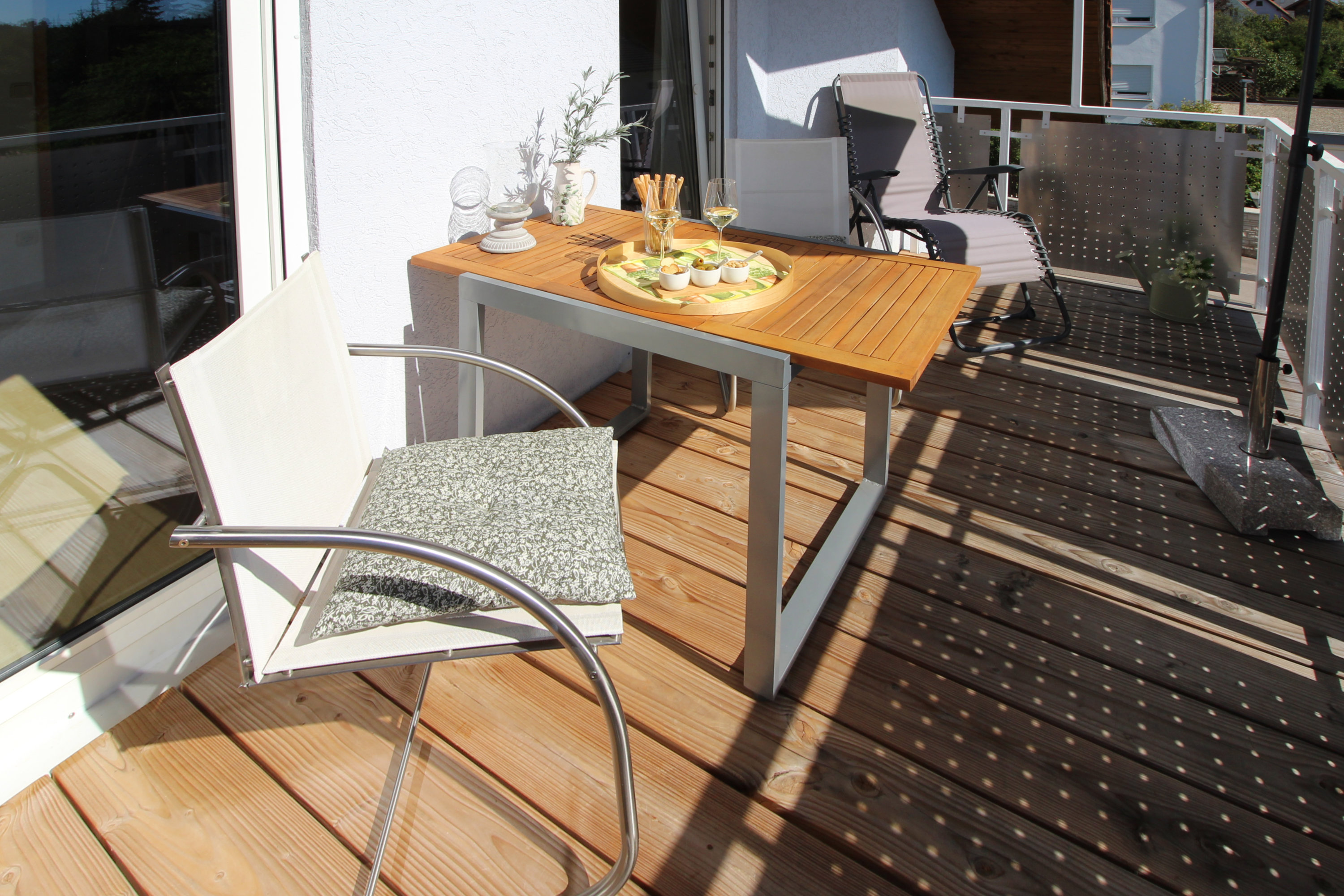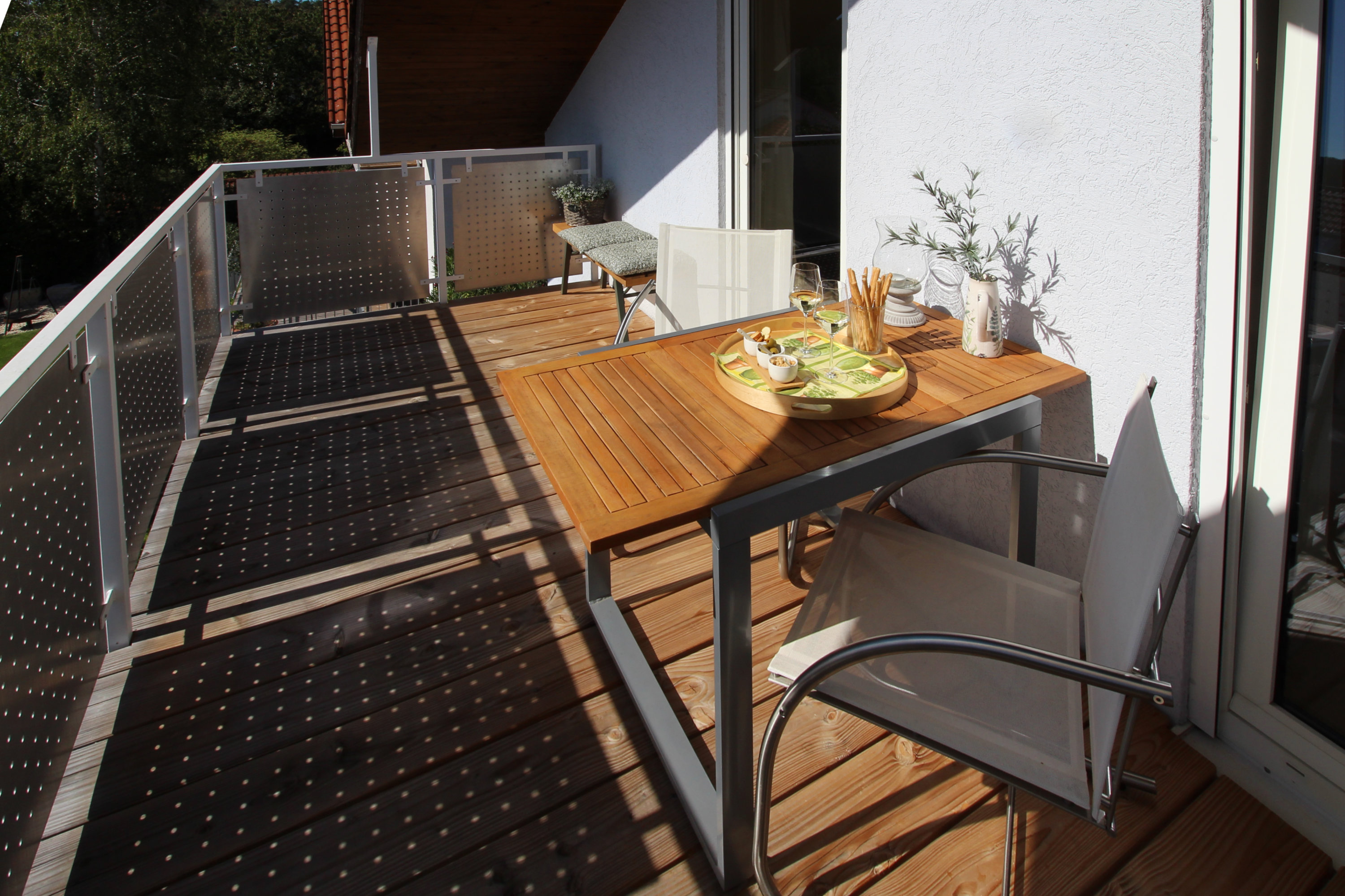 Die schöne Aussicht auf dem Balkon lädt zu einem kleinen „Sundowner“ ein.