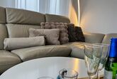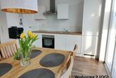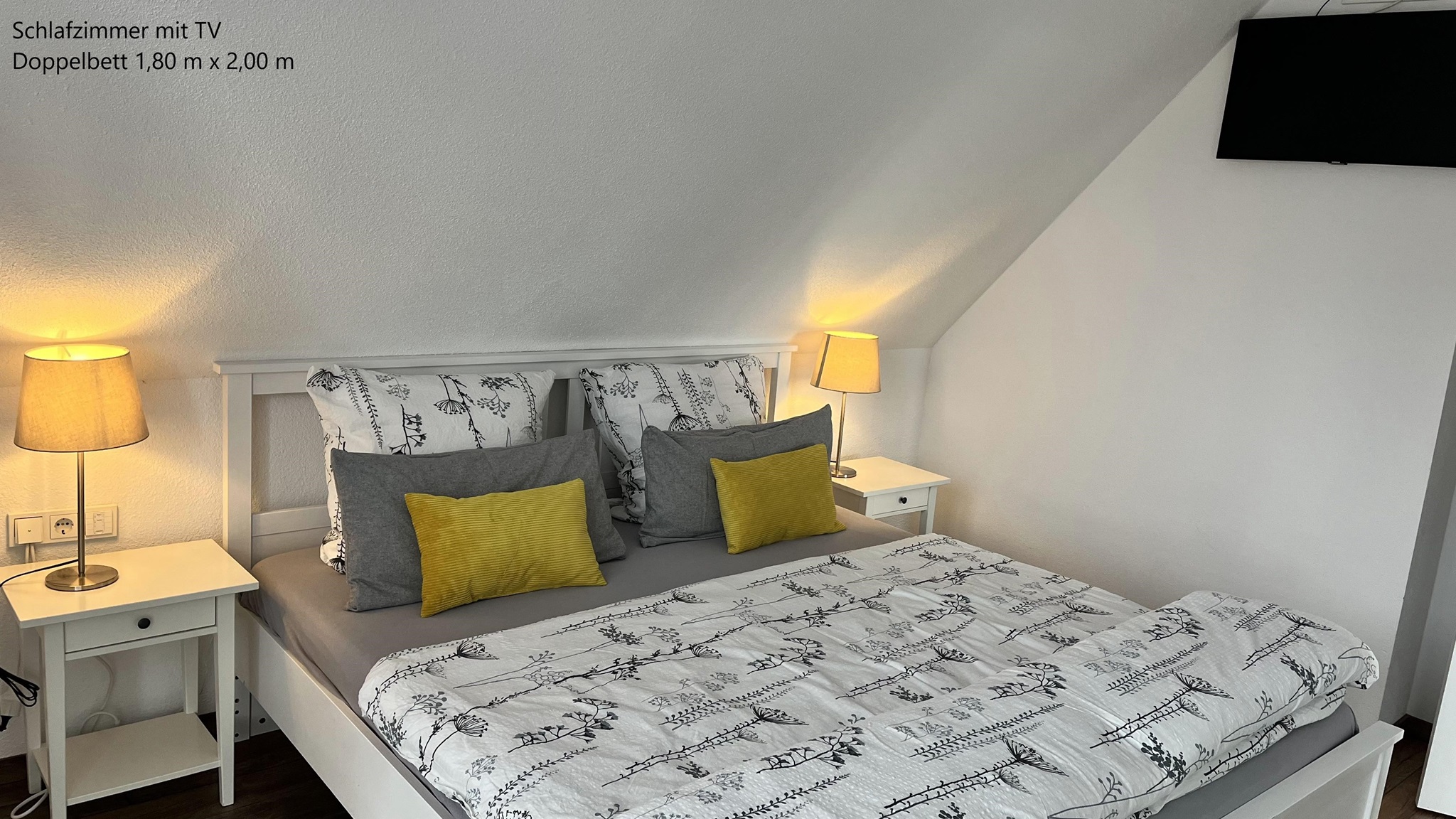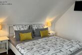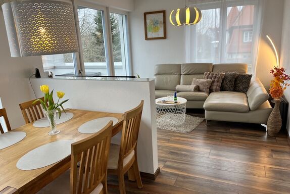 Die Ferienwohnung (57 m²) für 3 Personen liegt im ersten Stock. Durch die großzügigen Glasflächen zur Südseite ist die Wohnung lichtdurchflutet und wärmt das Herz beim Betreten. Die vollausgestattete, moderne Küche ist mit einem zusätzlichen Kaffeevollautomat, Backofen, Gefrierfach, Toaster, Wasserkocher, Spülmaschine und Geschirrtüchern ausgestattet. Im Wohnzimmer laden eine große, bequeme Eckcouch mit ausfahrbarer Fußstütze und einem großen SAT-TV zum Verweilen ein. Das gemütliche Schlafzimmer mit Doppelbett, Fernsehr und großem Spiegelschrank strahlt eine Ruhe aus. Im kleineren zweiten Schlafzimmer kann das Einzelbett auf 160x200 verbreitert werden. Das großzügige Bad hat eine schwellenfreie Dusche, WC sowie Fön und Handtücher. Der Balkon mit Sonnensegel und Blick zum See in 500 m. Entfernung bei Kerzenschein rundet den Urlaubstag ab.