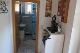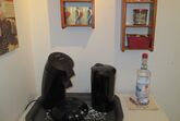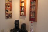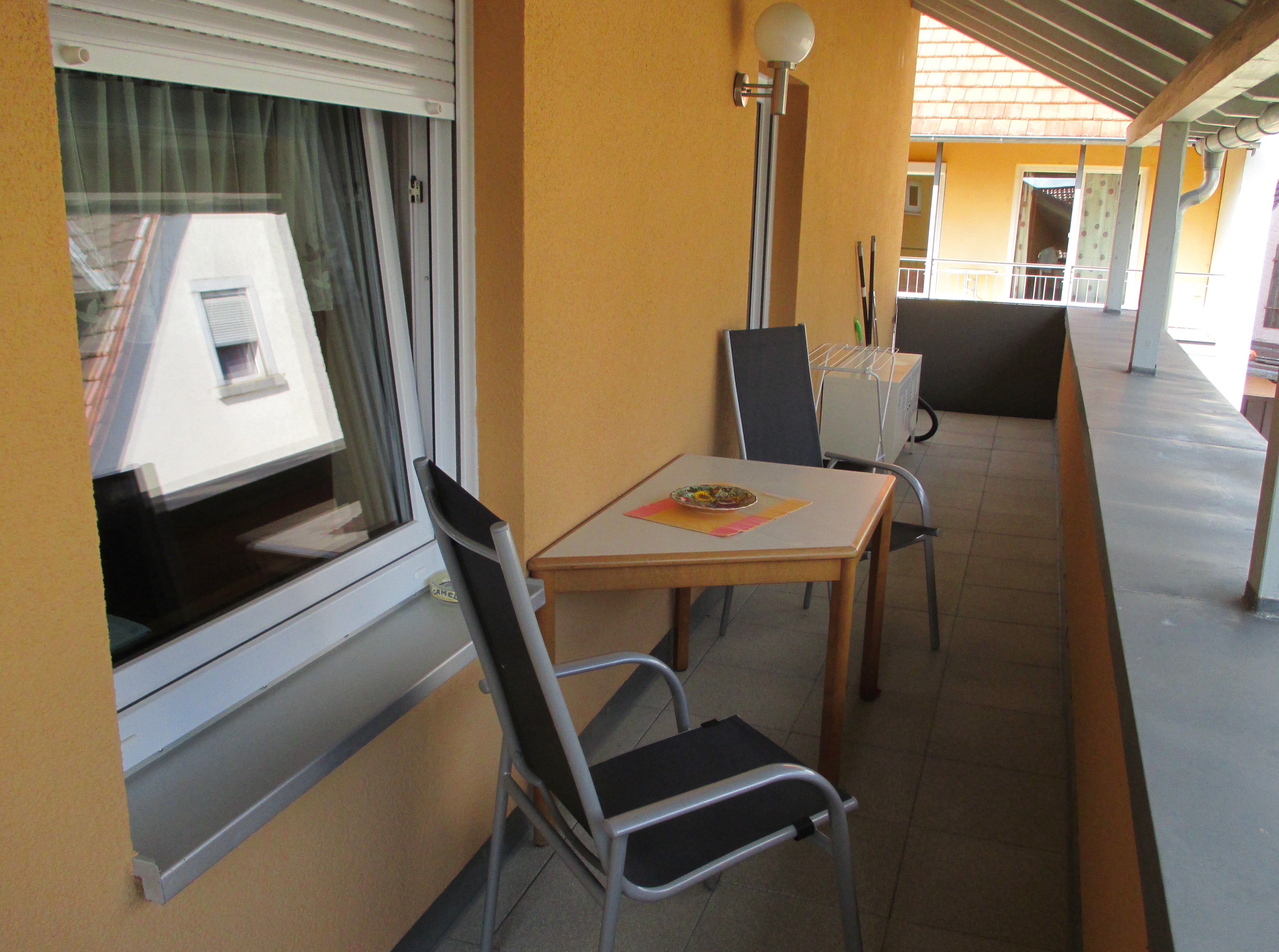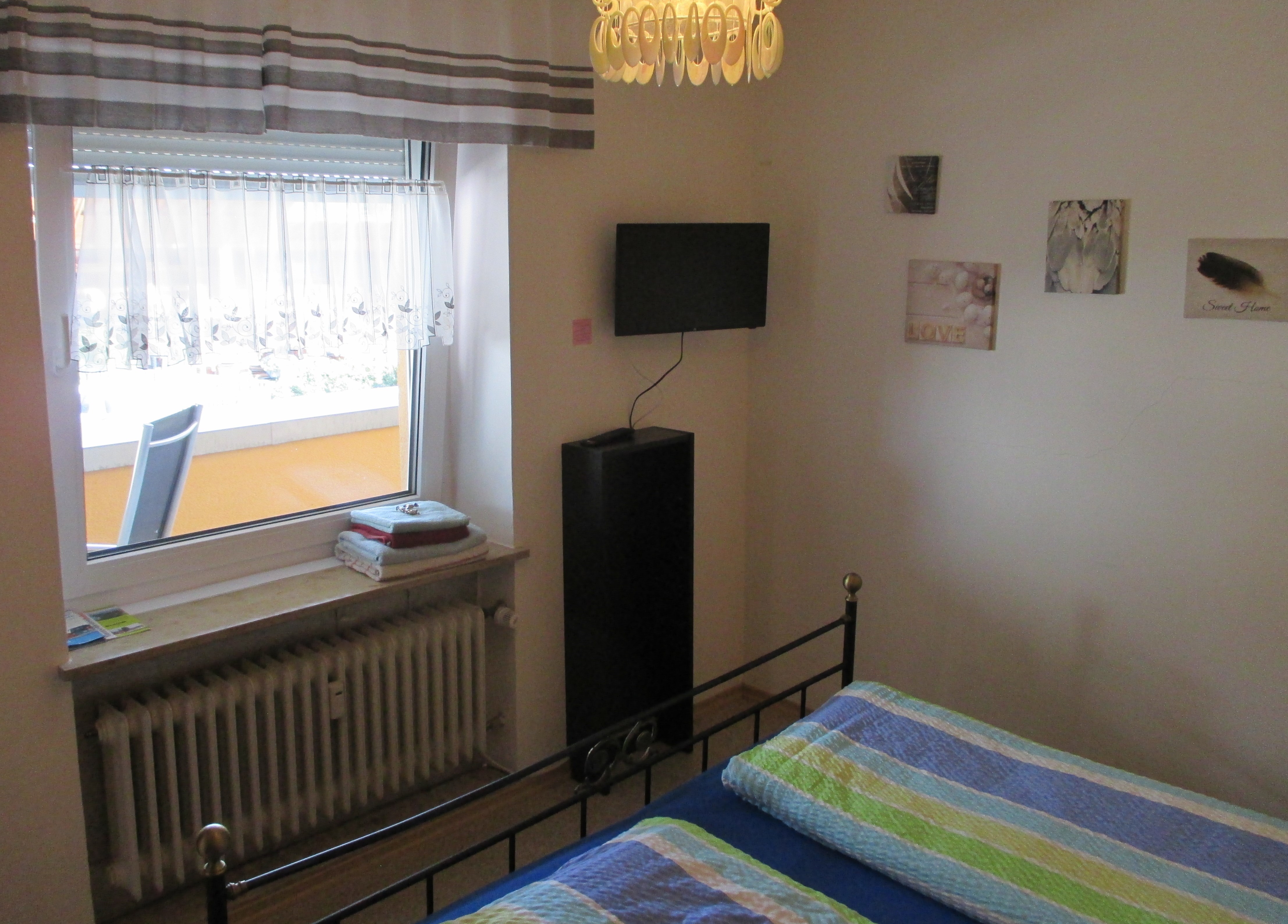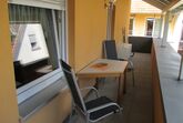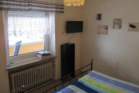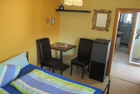 Kleines Appartement mit bequemen Doppelbett und Sitzgelegenheit, Dusche/WC, ohne Küche mit großem Balkon. Kaffeemaschine, Wasserkocher und kleiner Kühlschrank vorhanden.