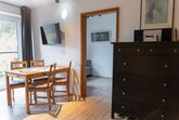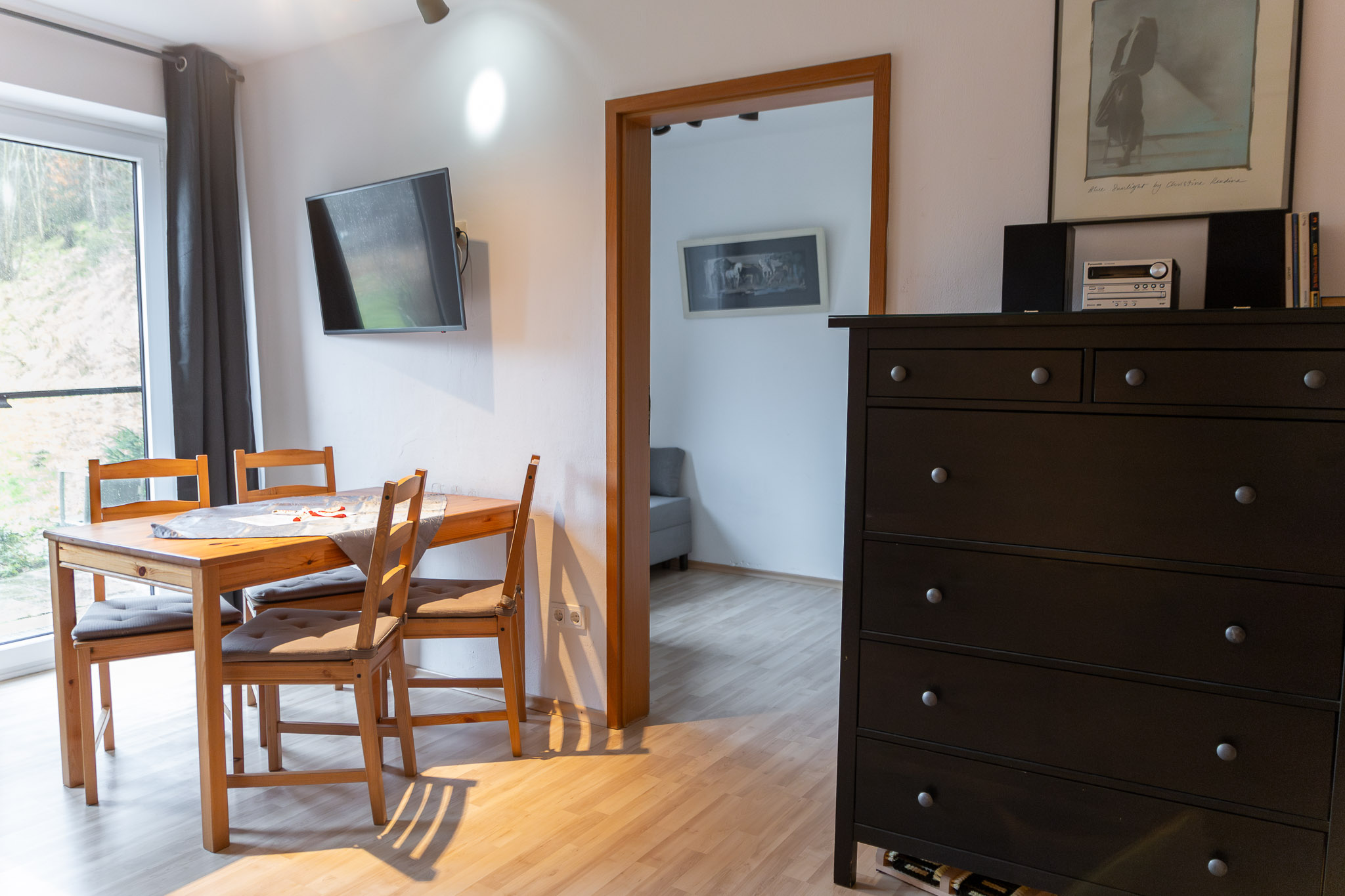 Der Wohn-/Essbereich ist eingerichtet mit einem großen Sofa mit Recamiere (ausziehbar zum Doppelbett mit 140cm Breite), einem Esstisch mit 4 Stühlen, einem großen Flachbildfernseher, einer großen Kommode mit viel Stauraum und einer Kleinstereoanlage mit USB-Anschluss und Bluetoothfunktion.