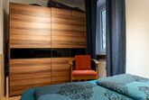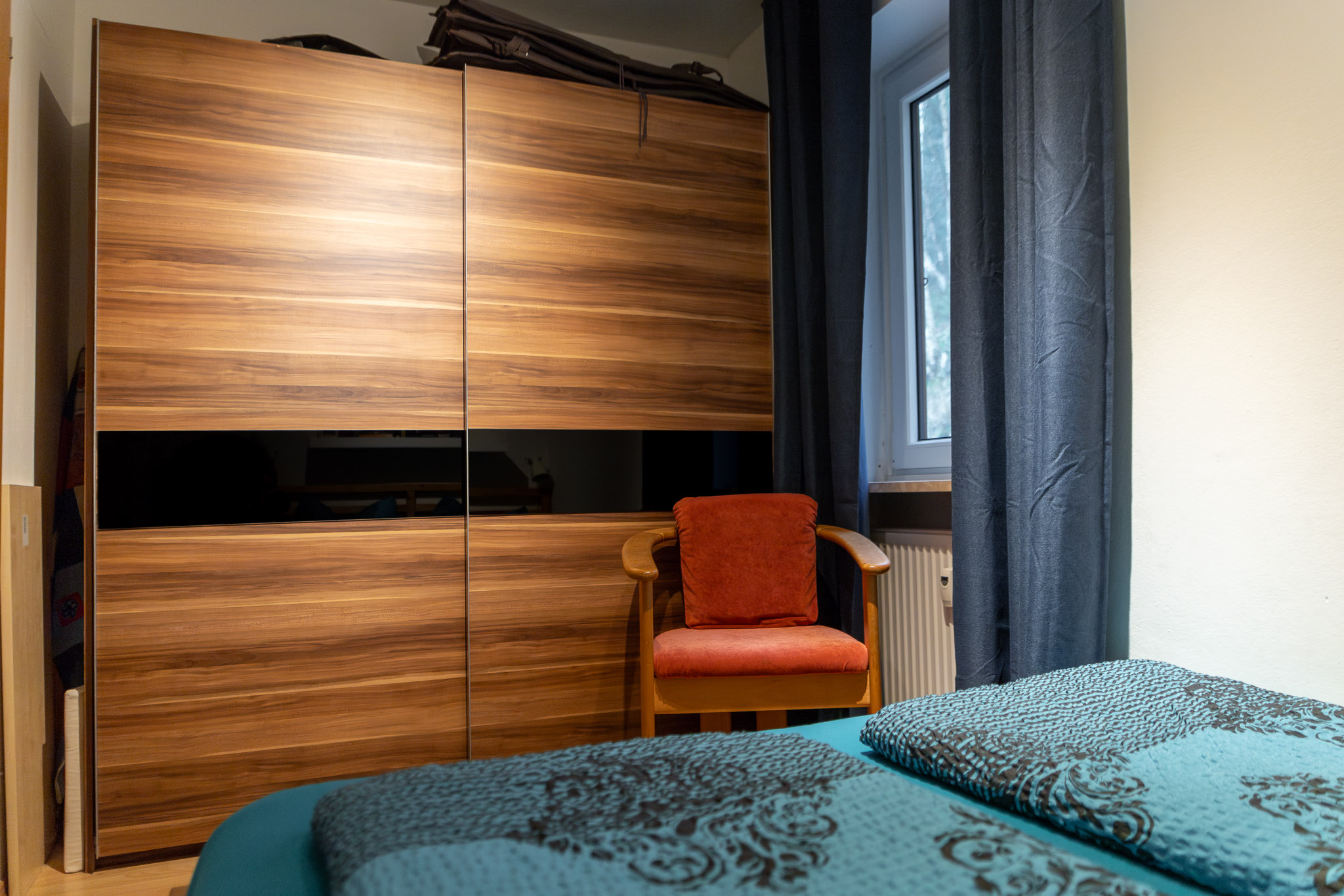 Das erste Schlafzimmer ist ausgestattet mit einem Doppelbett (160cm x 200cm), einer Nachtkonsole mit Handyladestation, zwei Leselampen, einer Ablage und einem großen Schwebetürenschrank.