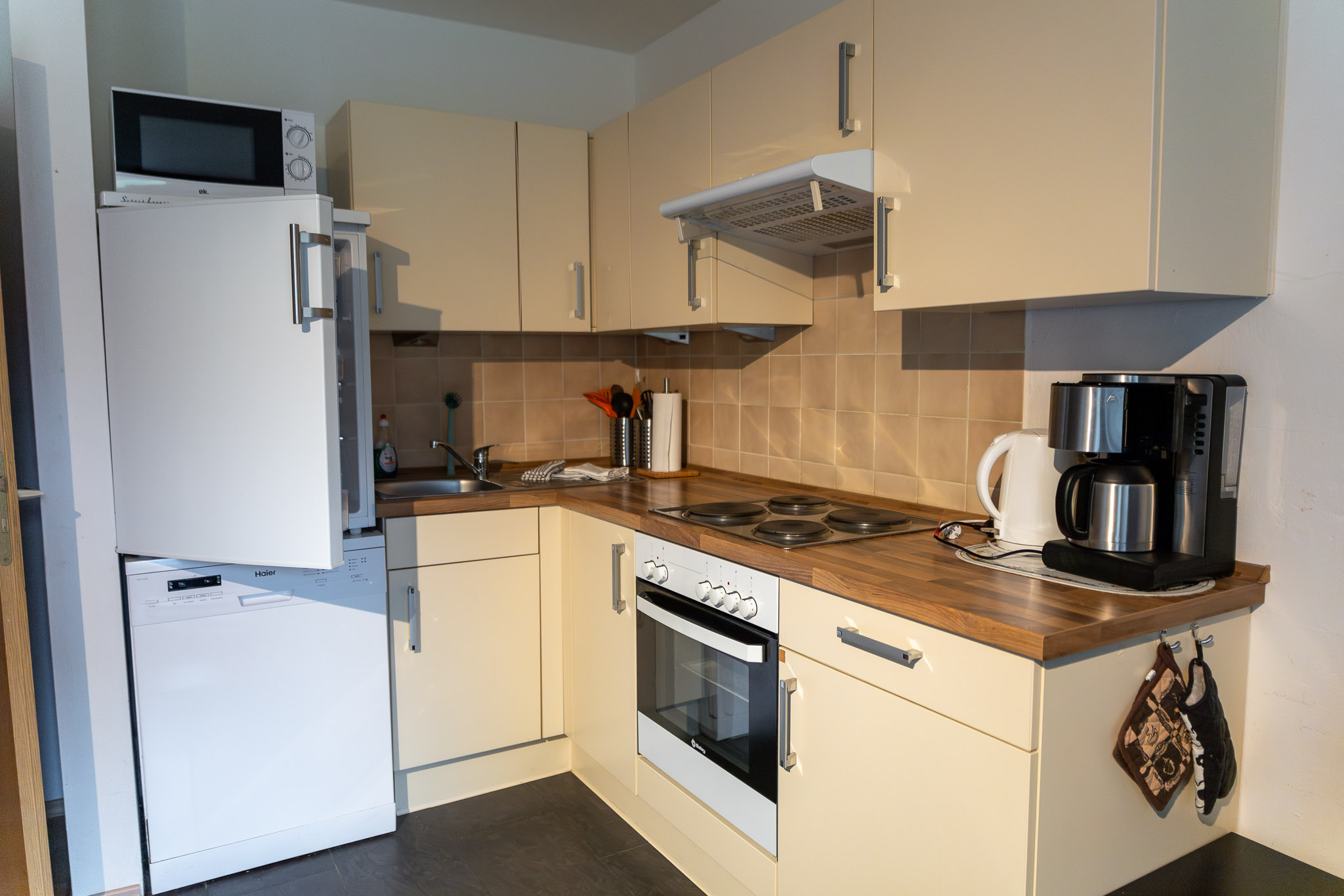 Die Küche ist mit Geschirrspüler, Gefrierschrank, Herd mit Backofen, Mikrowelle, Toaster, Wasserkocher, Kaffeemaschine, sowie allen wichtigen Küchenutensilien ausgestattet.