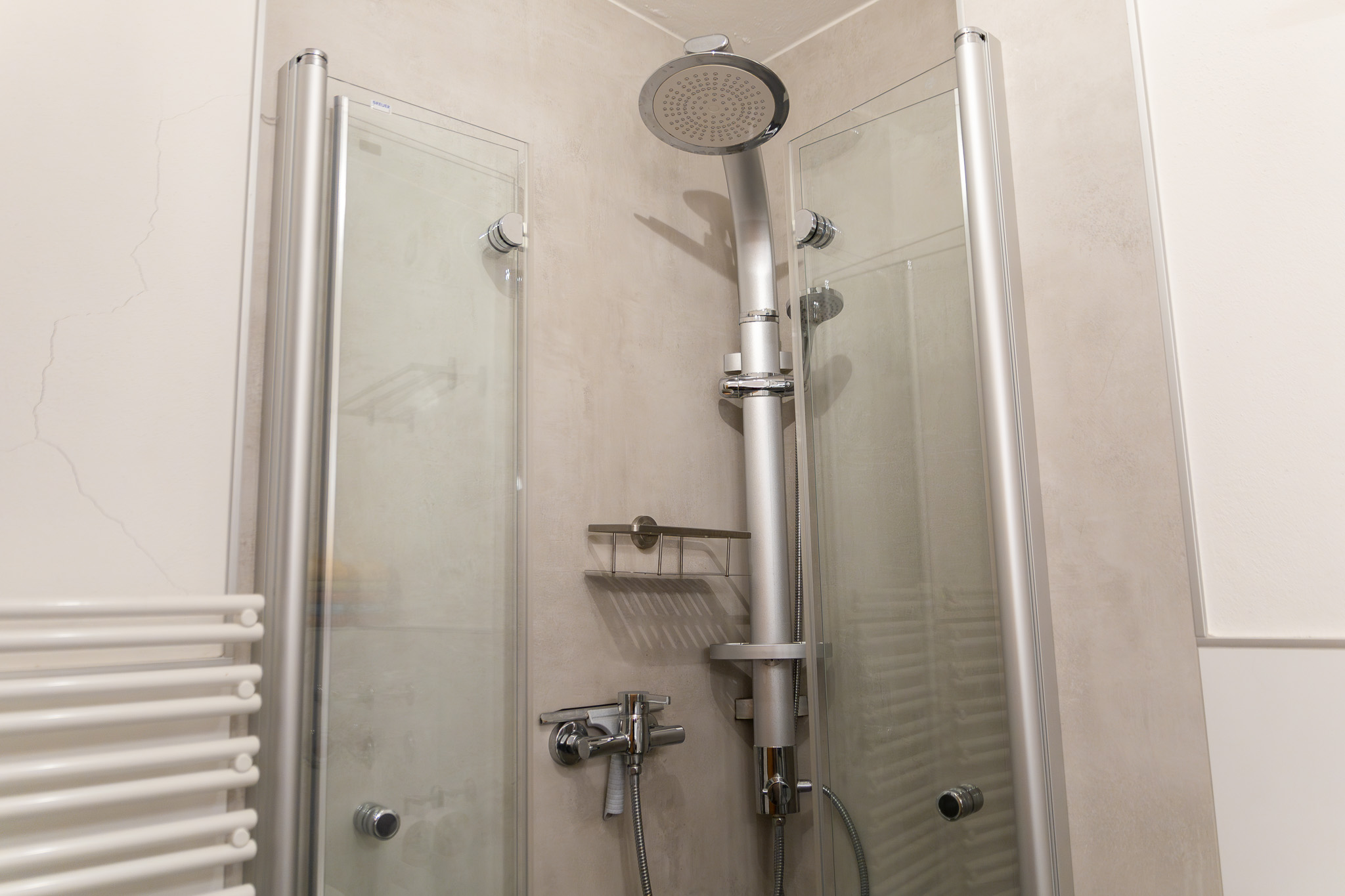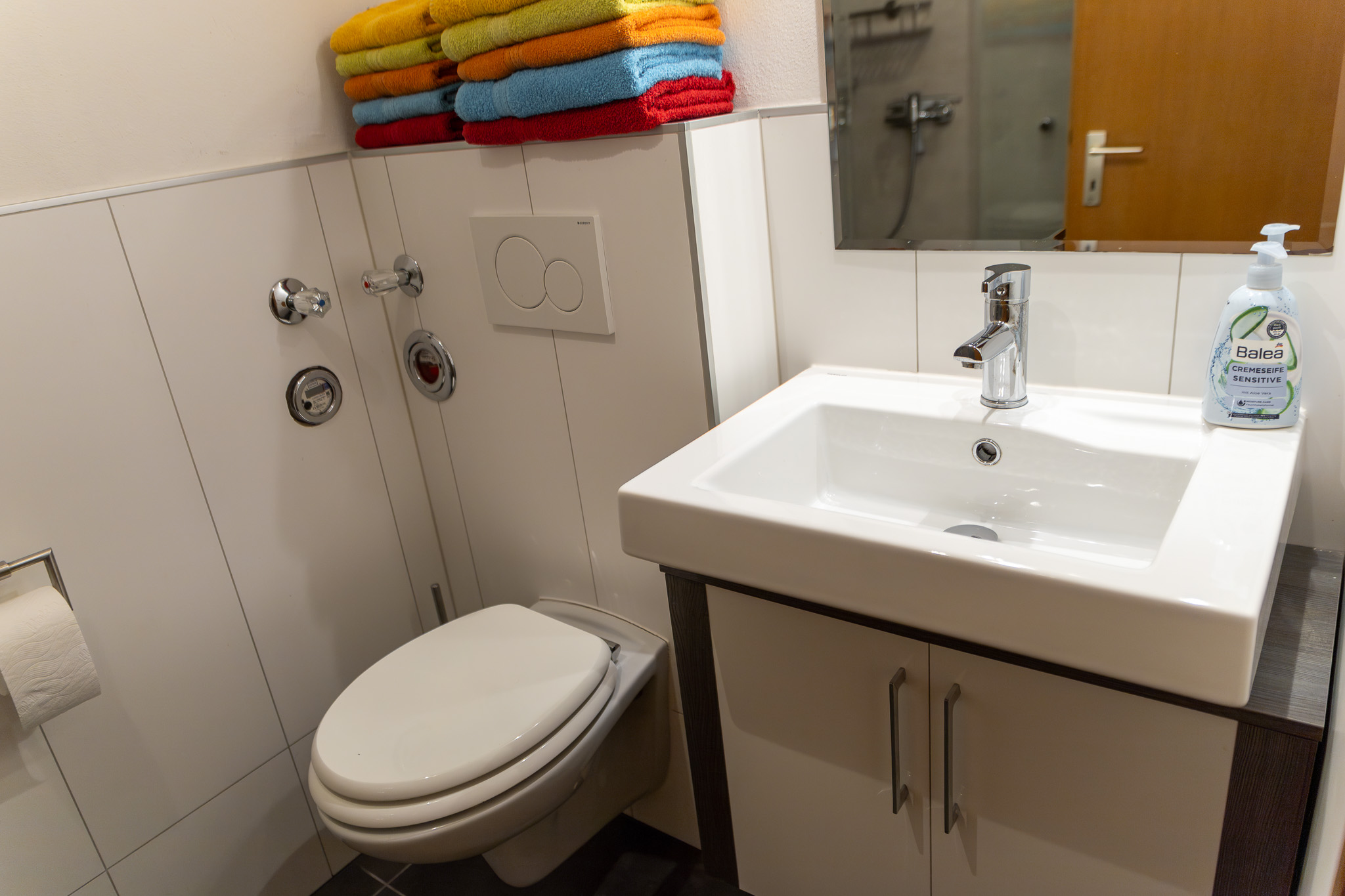 Das Bad, welches 2017 komplett renoviert wurde, verfügt über eine ebenerdige Dusche, eine Toilette und einen Waschtisch mit großem Spiegel.