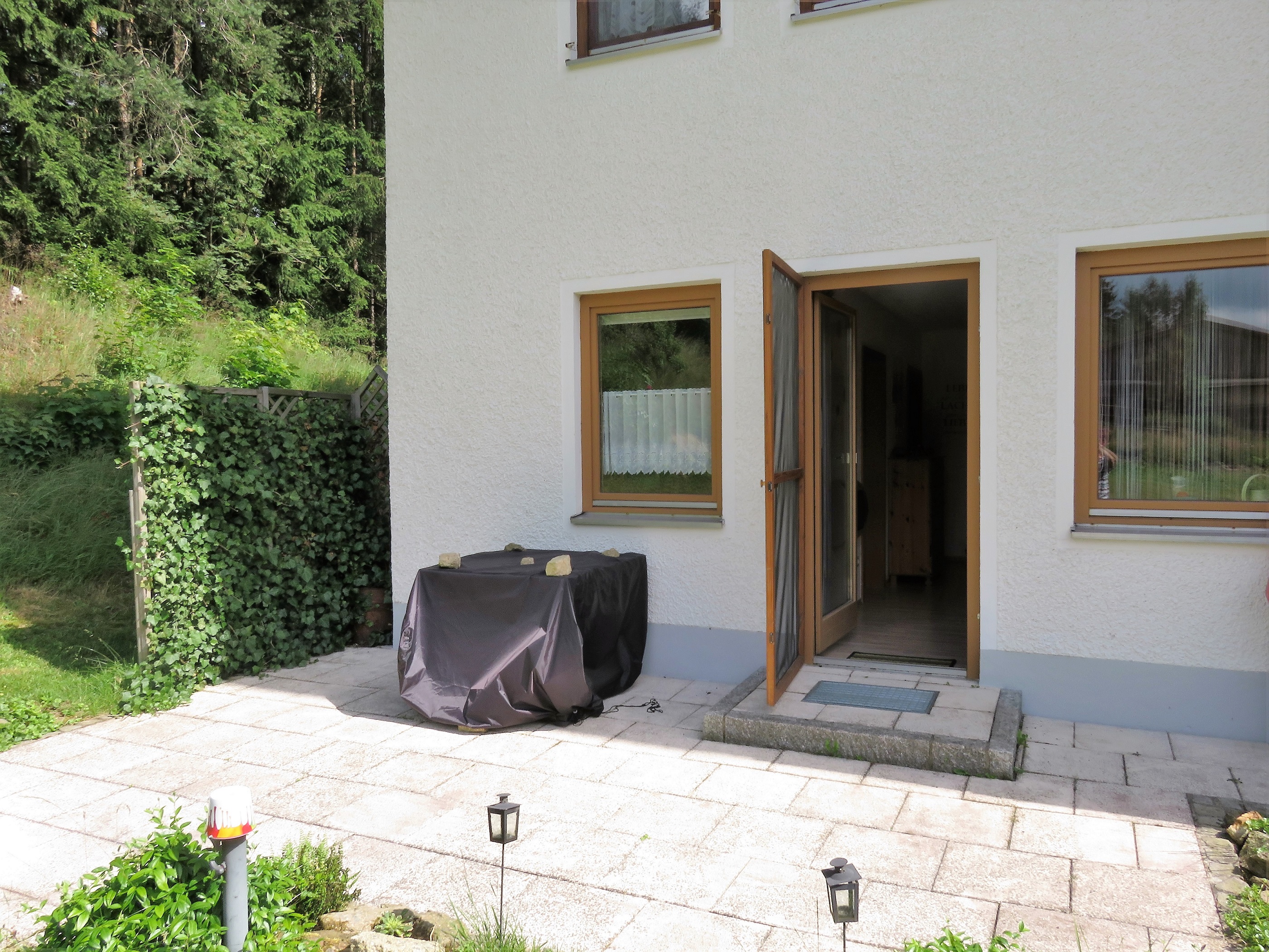 Vom Essbereich gelangt man ebenerdig direkt auf die kleine Terrasse, die über einen Tisch, Stühle mit Auflagen, einen Grill und einen Sonnenschirm verfügt. Von dort hat man über die angrenzende Wiese einen schönen Blick auf das Gelände des Reiterhofs Finkenmühle.