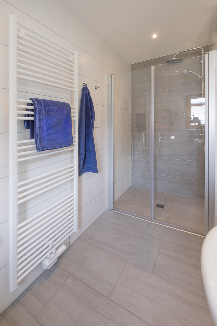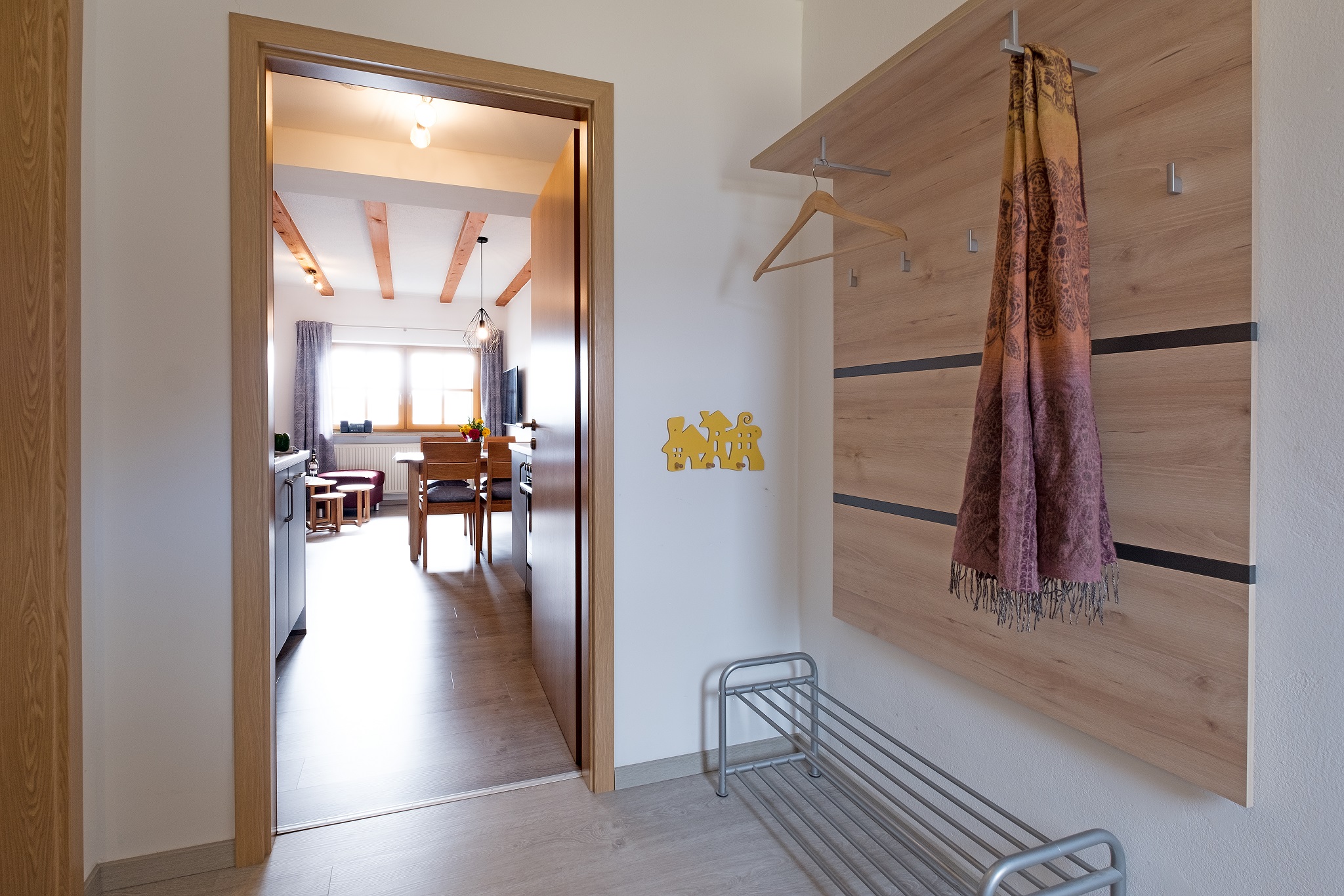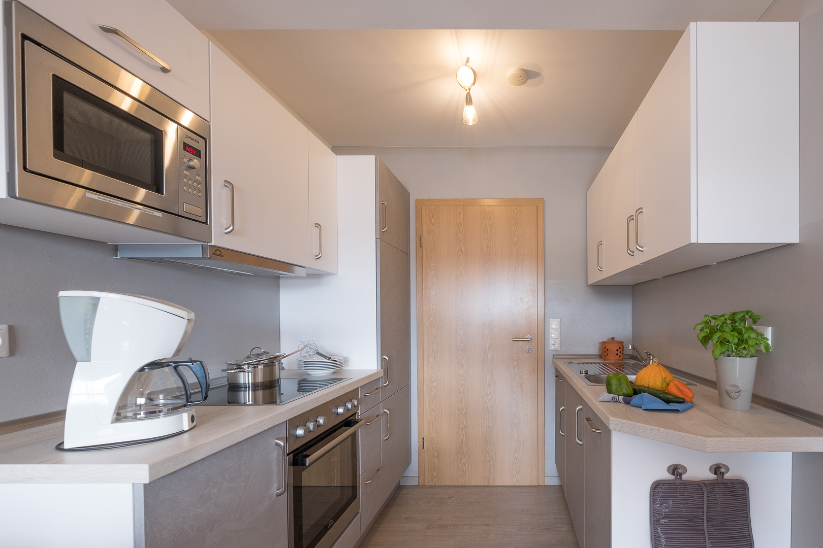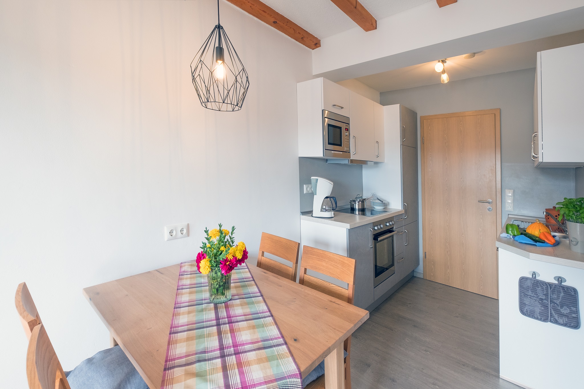 Unsere moderne Ferienwohnung 4 ist beliebt bei Familien. Sie hat zwei großzügige Schlafzimmer, wobei wir hier Babybetten bereitstellen können oder das Sofa für ein fünftes Familienmitlied im Kinderzimmer nutzen können. Die Küche ist voll ausgestattet (z.B. Spülmaschine, Kühlschrank, Kochfeld, Mikrowelle, Wasserkocher) und am angrenzenden Essbereich kann man gemütlich beieinander sitzen. Der Wohnbereich ist mit Sofa, Hocker und TV ausgestattet. Im Flur ist ausreichend Platz für Jacken und Schuhe vorhanden. Im Bad befindet sich eine bodengleiche Dusche. WLAN