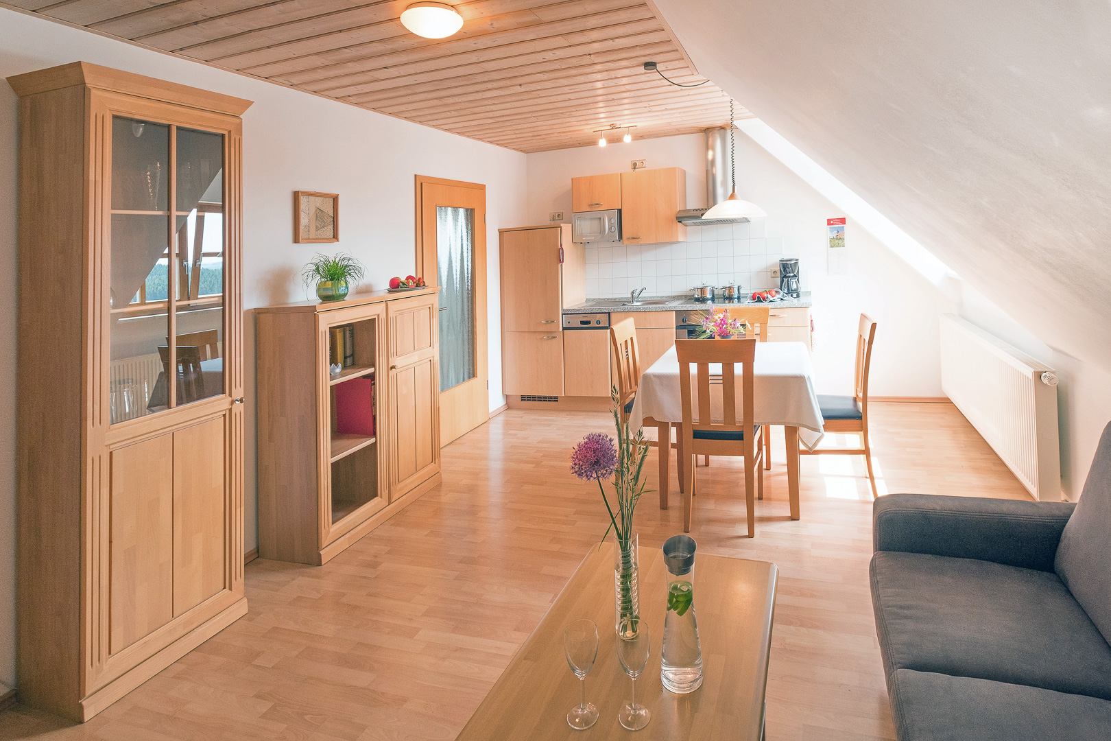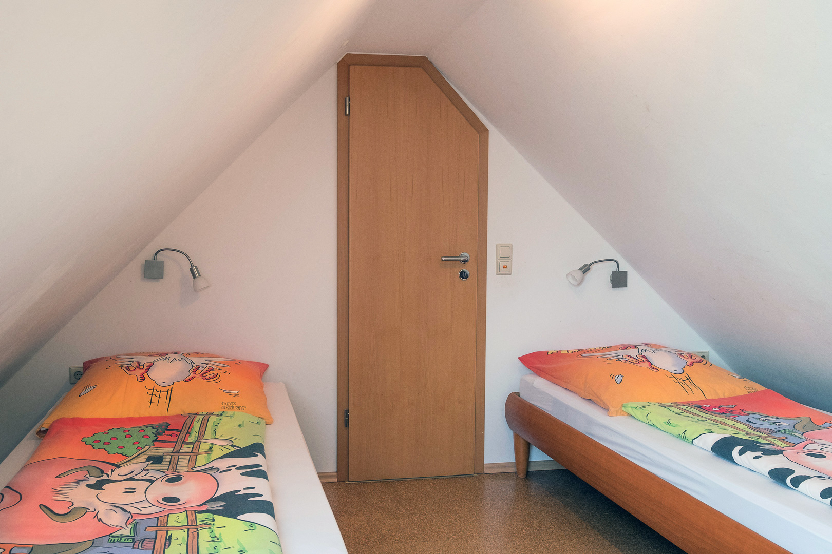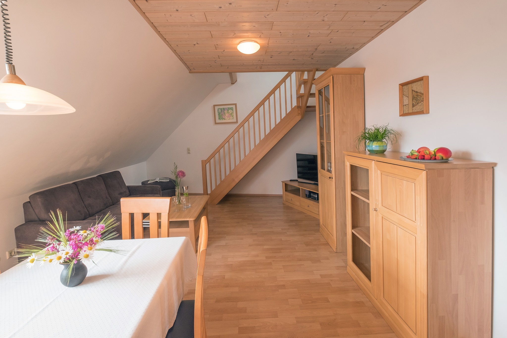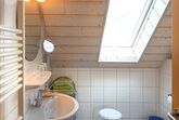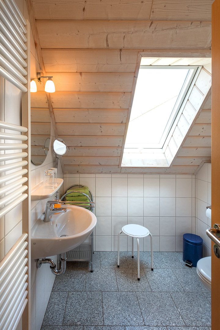 Unsere gemütliche Ferienwohnung 5 liegt im Dachgeschoss. Ein ganz besonderes Extra wartet hier auf die Kinder: Sie haben ihren eigenen Schlafbereich und ihr eigenes WC eine Etage höher, direkt unter dem Dach. Im großzügigen Wohnbereich verläuft die Treppe in das Domizil der Kinder nach oben. Die Küche ist komplett ausgestattet (z.B. Mikrowelle, Geschirrspüler, Wasserkocher, Ceran-Kochfeld). Im weiteren Schlafzimmer ist viel Platz, so dass wir auch bequem ein Kinderbettchen für die Kleinsten unterbringen. Das Bad mit Dusche und WC ist gleich daneben. Auf WLAN müssen sie auch hier nicht verzichten.