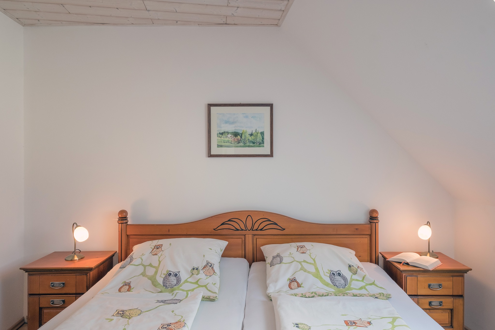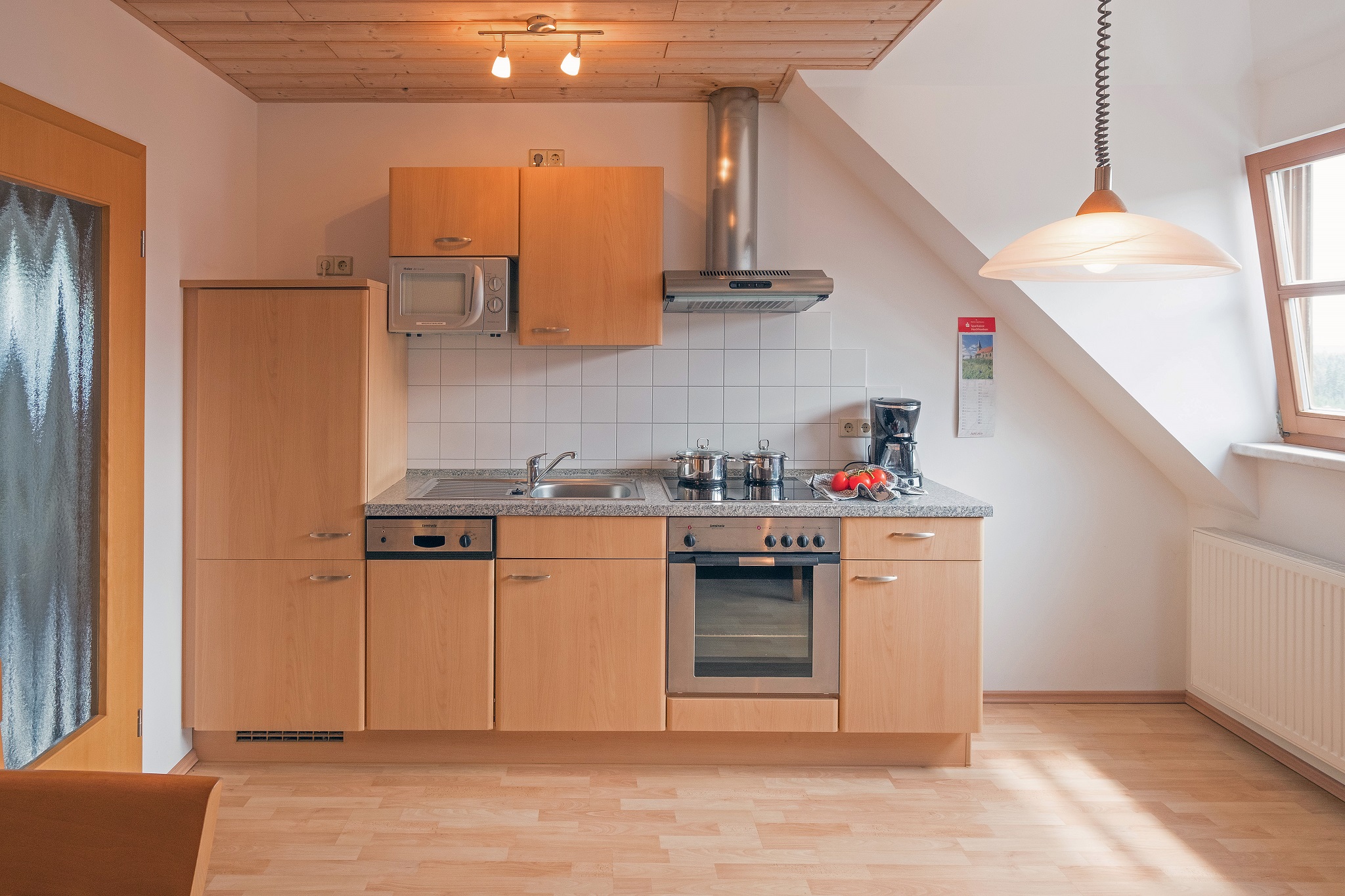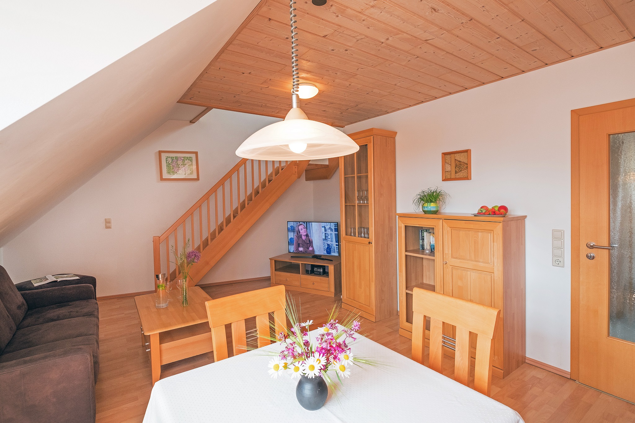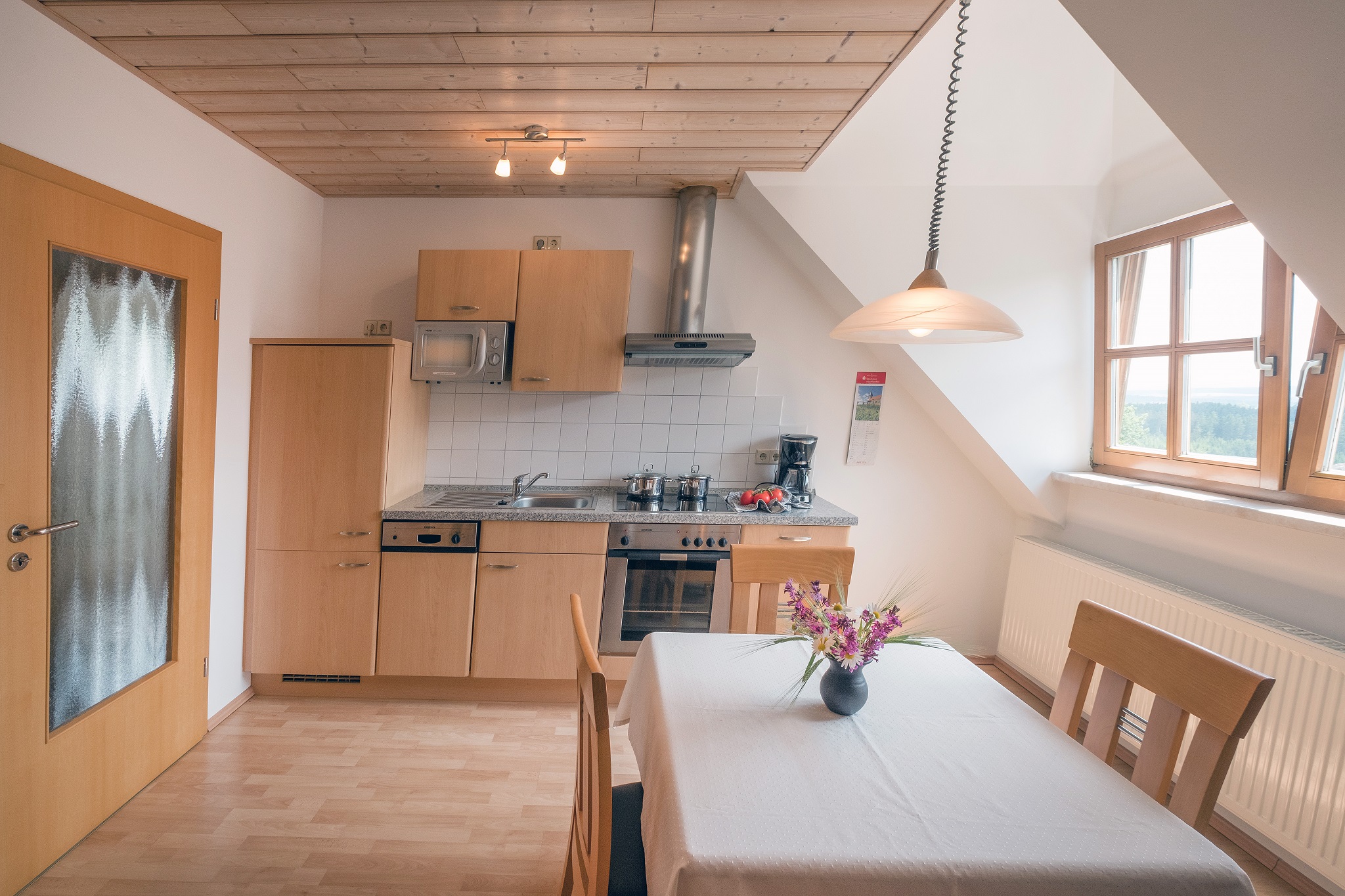 Unsere gemütliche Ferienwohnung 5 liegt im Dachgeschoss. Ein ganz besonderes Extra wartet hier auf die Kinder: Sie haben ihren eigenen Schlafbereich und ihr eigenes WC eine Etage höher, direkt unter dem Dach. Im großzügigen Wohnbereich verläuft die Treppe in das Domizil der Kinder nach oben. Die Küche ist komplett ausgestattet (z.B. Mikrowelle, Geschirrspüler, Wasserkocher, Ceran-Kochfeld). Im weiteren Schlafzimmer ist viel Platz, so dass wir auch bequem ein Kinderbettchen für die Kleinsten unterbringen. Das Bad mit Dusche und WC ist gleich daneben. Auf WLAN müssen sie auch hier nicht verzichten.