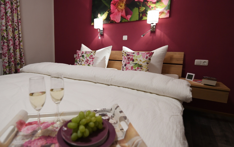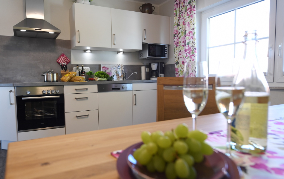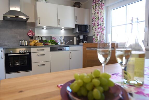 Die Wohnung Wildrose ist ca. 80m² groß, befindet sich im ersten Stock des Haupthaus und verfügt über einen Balkon. Die Wohnung hat eine vollausgestattete Einbauküche (Spülmaschine, E-Herd mit Glaskeramikkochfeld, Kühlschrank mit Gefrierfach, Mikrowelle und diverse Kleingeräte).