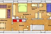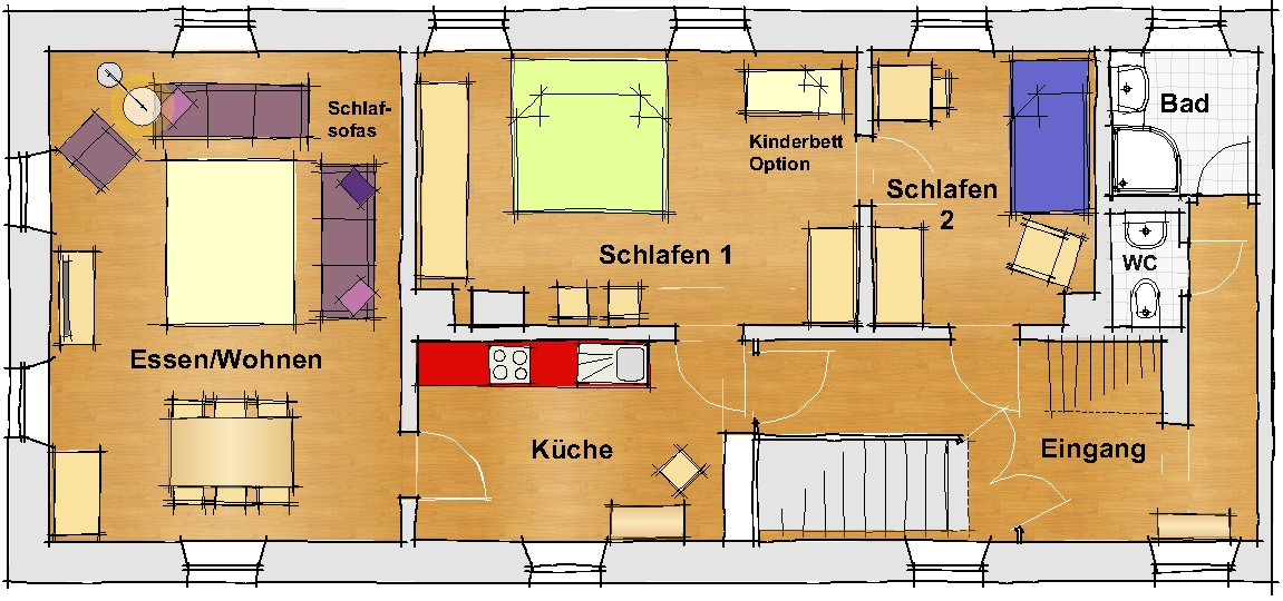 1 Schlafzimmer mit Doppelbett, 1 Schlafzimmer mit Einzelbett + Möglichkeit Zustellbett, Wohnzimmer mit 2 Schlaf-Sofas und Essbereich, Küche, Bad mit Dusche, separates WC, Handtücher und Bettwäsche inklusive.