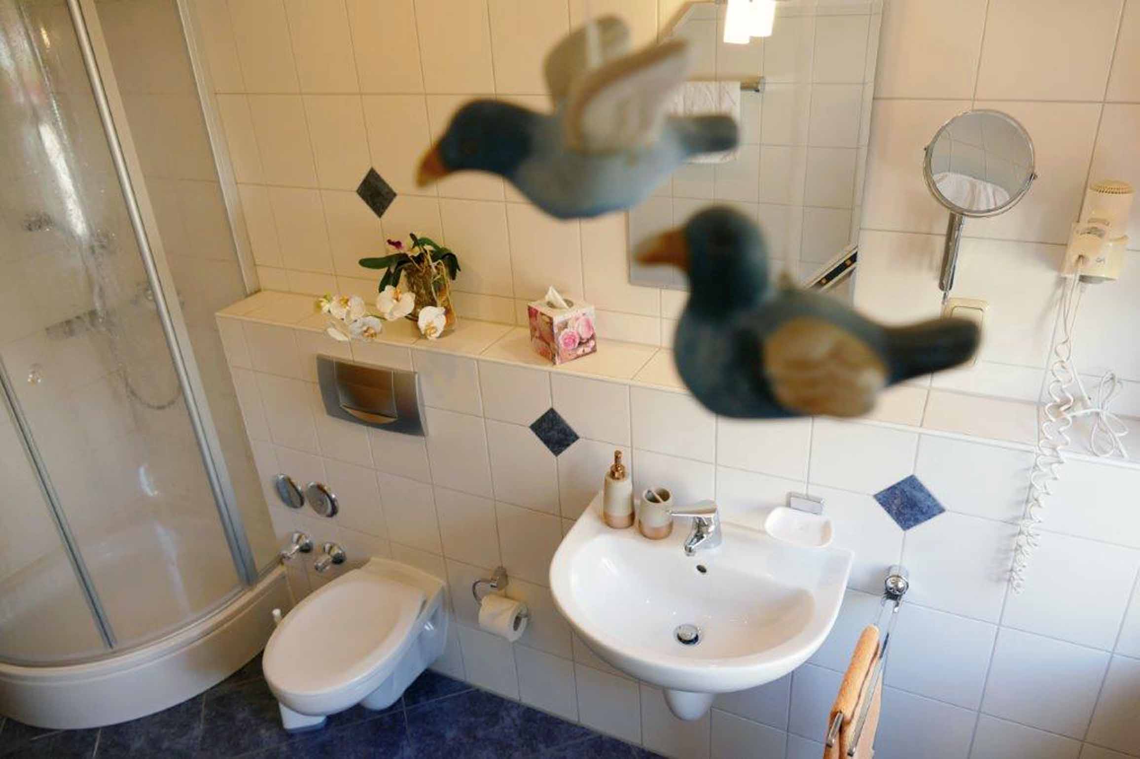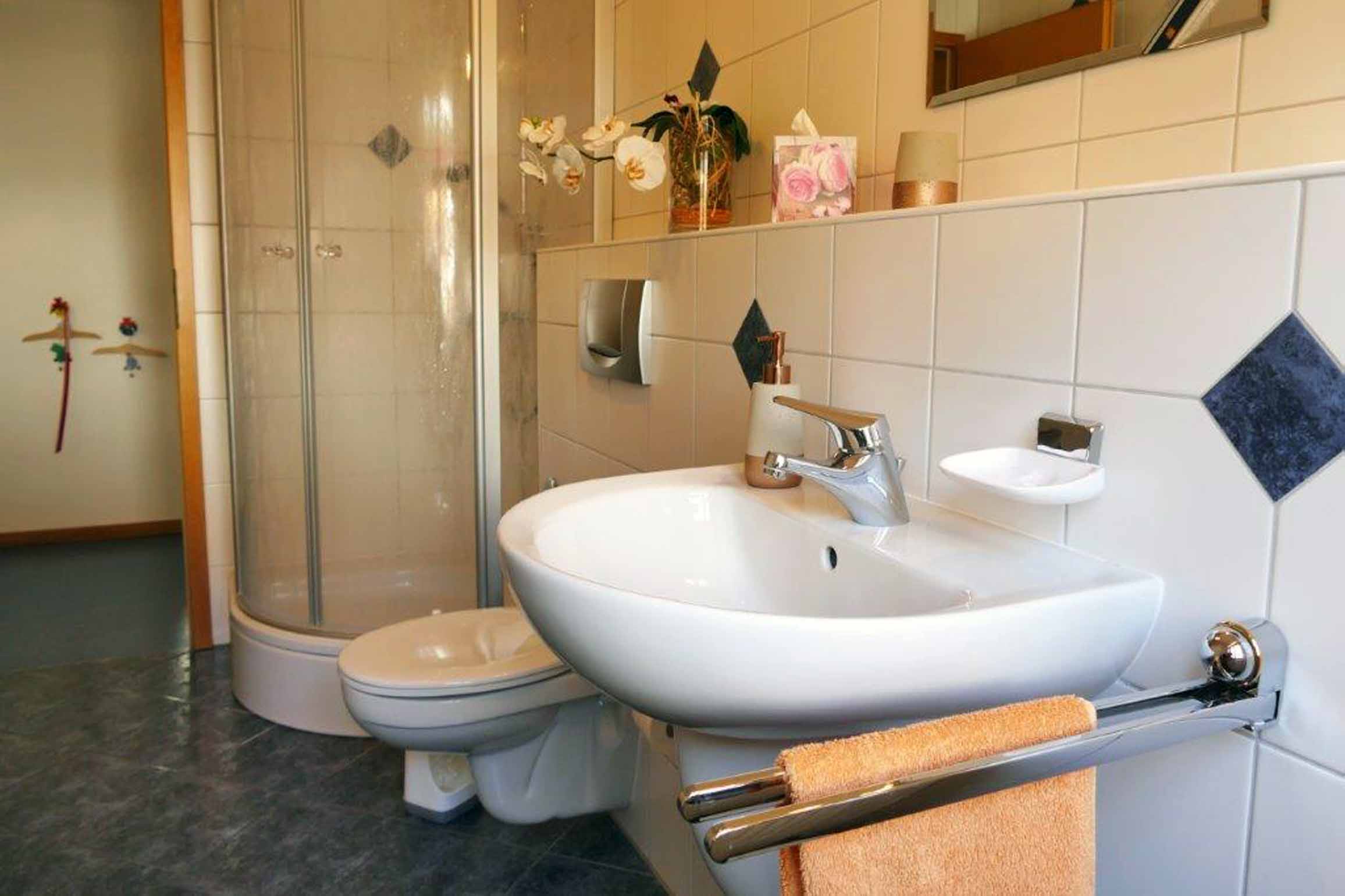 Das Tageslichtbad ist ausgestattet mit einer Dusche, einem Waschbecken, WC und Föhn.