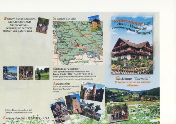 Unsere Privatpension Gästehaus Cornelia ist idyllisch im Herzen des Naturpark Spessart ist Wildensee gelegen. Der staatlich anerkannte Luftkurort bietet beste Vorraussetzungen für einen erholsamen Aufenthalt. Der Spessart, das größte Laubwaldgebiet in Deutschland, zeigt sich als wahres Urlaubsparadies für Wanderfreunde. Seine unberührte Natur lädt zu entspannenden Spaziergängen oder ausgedehnten Wanderungen durch reizvolle Täler und sonnige Lichtungen ein.