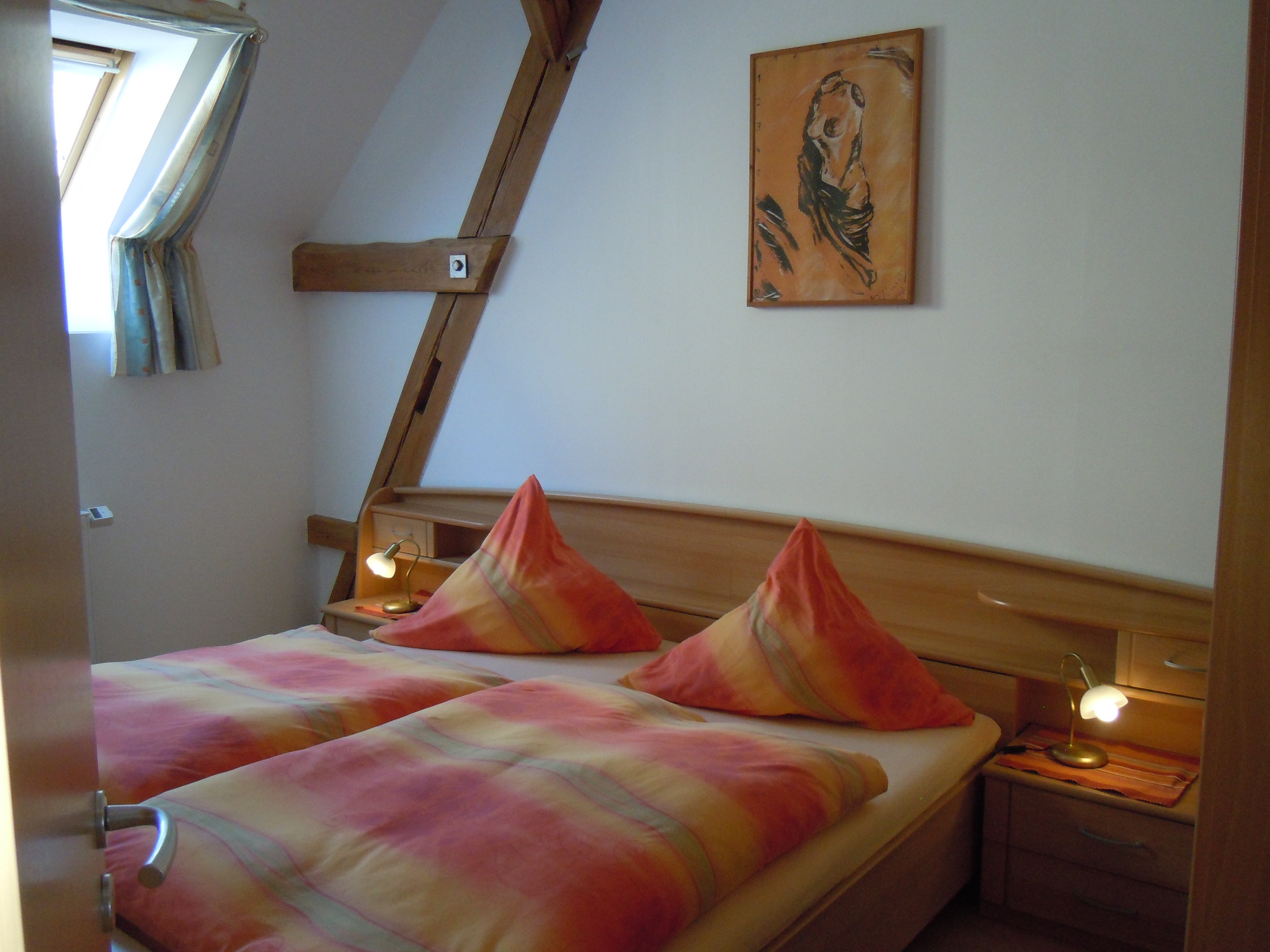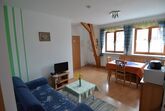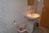 Ferienwohnung 5 befindet sich im ersten Obergeschoss und besteht aus einem Schlafraum mit Doppelbett, einem Schlafraum mit zwei Einzelbetten sowie einem großzügigen Wohnraum mit geräumiger Couch und einem komplett eingerichteten Küchenblock (Kaffeemaschine, Wasserkocher uvm.) mit Essplatz. Im Toilettenraum finden Sie eine Dusche, einen Waschtisch und ein WC. Auch Shampoo, Duschgel, Bodylotion und Seife stehen für Sie bereit.