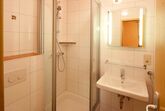 Das moderne Bad ist mit WC, Waschbecken und Dusche ausgestattet.
