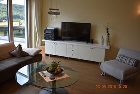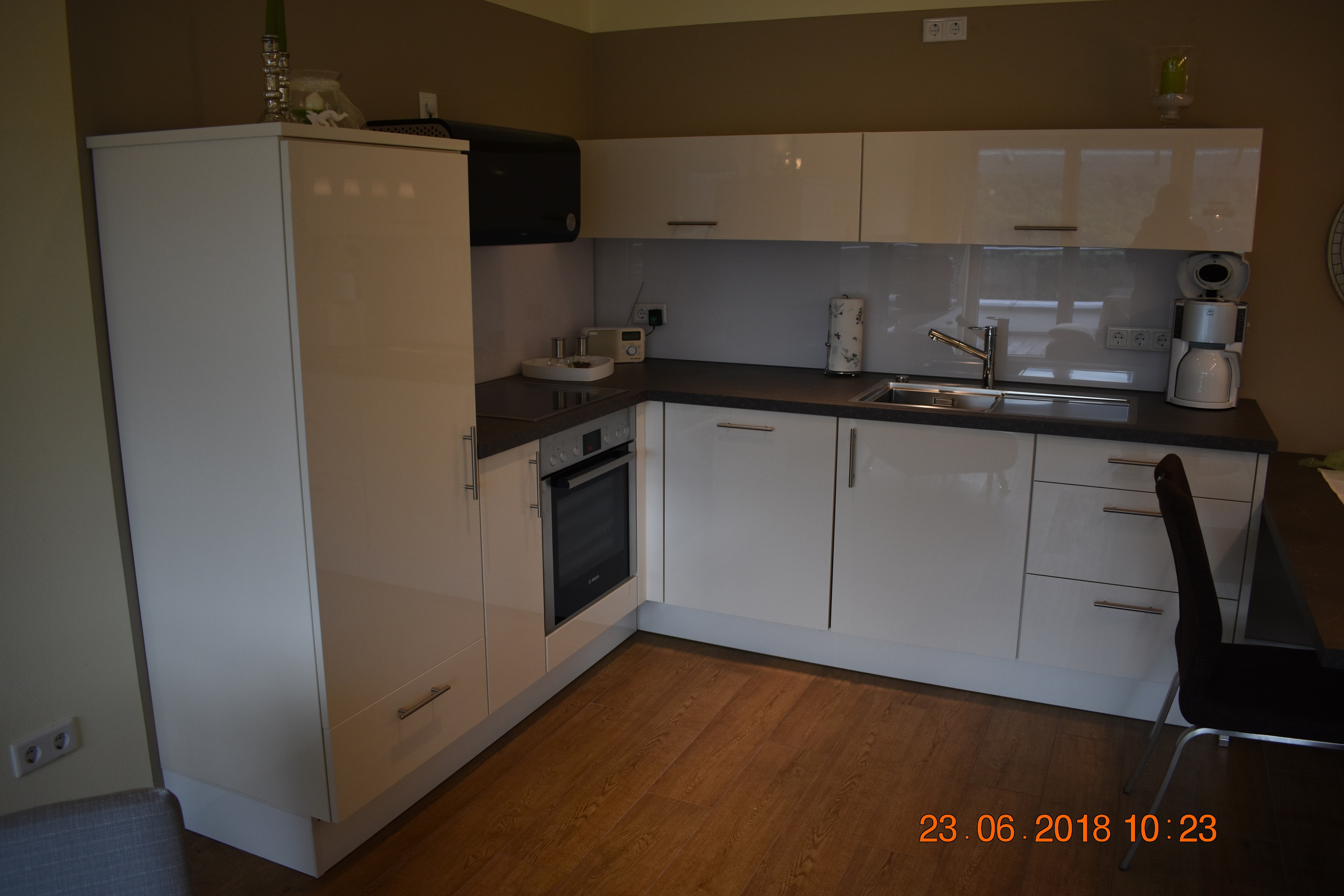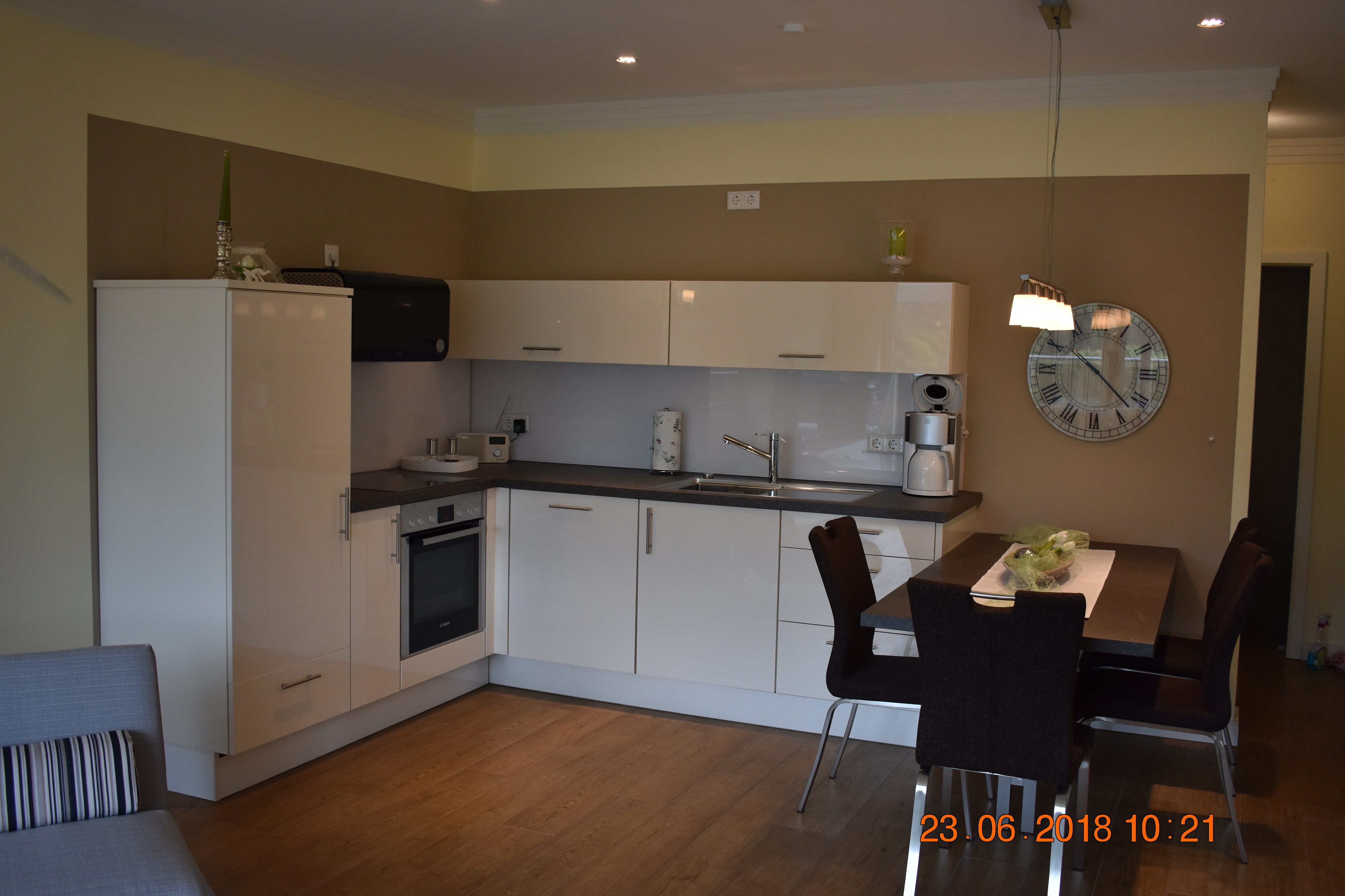 Die großzügige und komfortable Ferienwohnung mit 65qm und 24qm überdachter Terrasse verfügt über zwei Schlafzimmer, einmal mit einem Boxspring-Doppelbett, das zweite über ein Einzelbett. Der Wohnbereich ist offen gestaltet mit Küche, Essplatz für 4 Personen und dem Wohnbereich mit großzügiger Couch und Sessel. Hier haben sie auch DAB-Radio, Flat-Screen TV 127cm, Sat-Anlage und W-LAN für Ihre Unterhaltung. Die hochwertige Küche verfügt über Induktionskochfeld, Geschirrspüler, Backofen, Kühl-und Gefrierschrank, Microwelle, Kaffeemaschine, Toaster und Eierkocher.