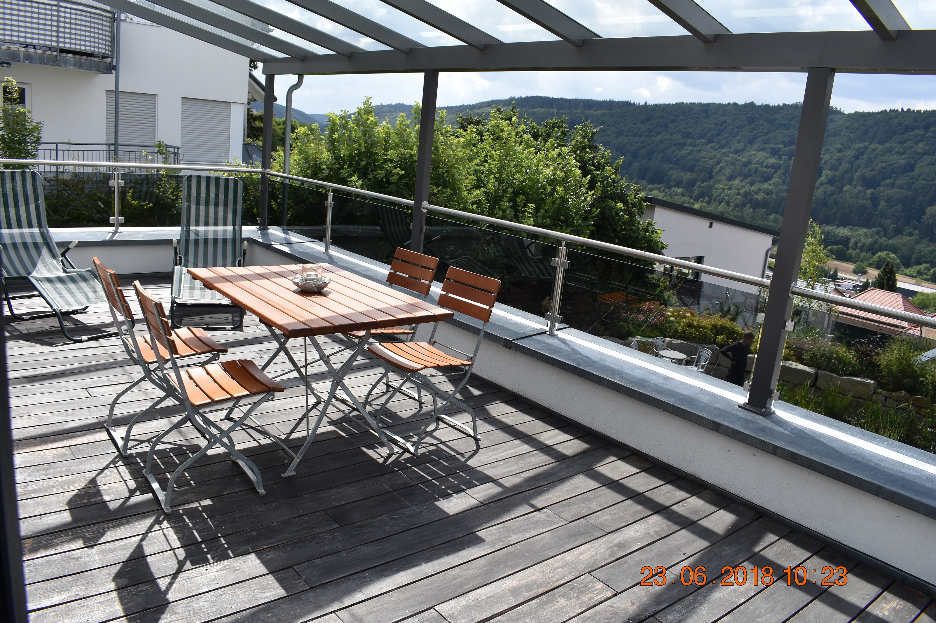 Die Terrasse mit Blick auf Garten und den Tal des Rain-Main-Donau-Kanals ist mit Glas überdacht. Zum relaxen und Sonne genießen finden sie dort zwei Liegen vor und für einen gemütlichen Abend ein Tisch und vier Stühle. Eine zweite Terrasse auf der Ostseite bietet Schatten an heißen Tagen.