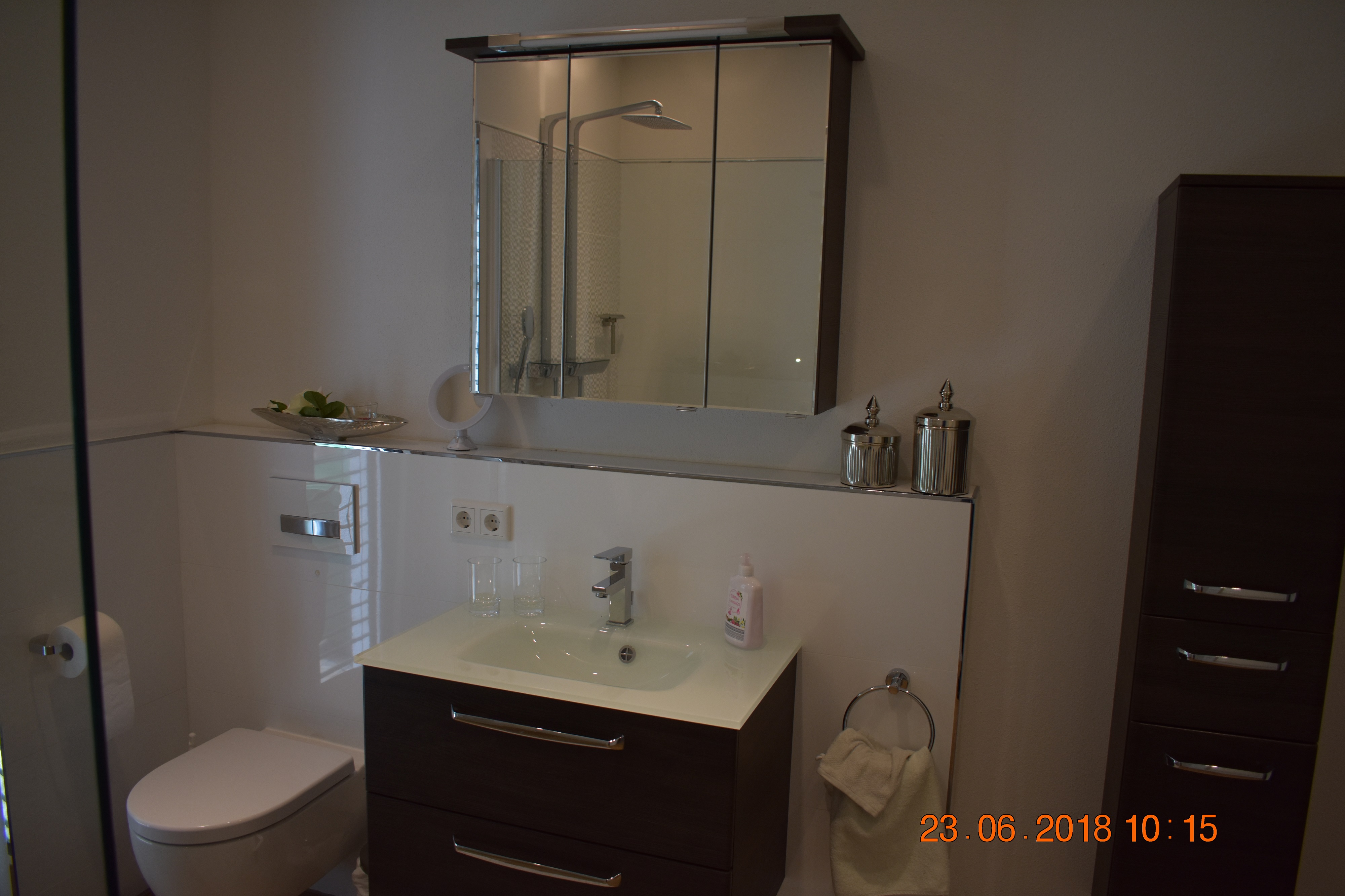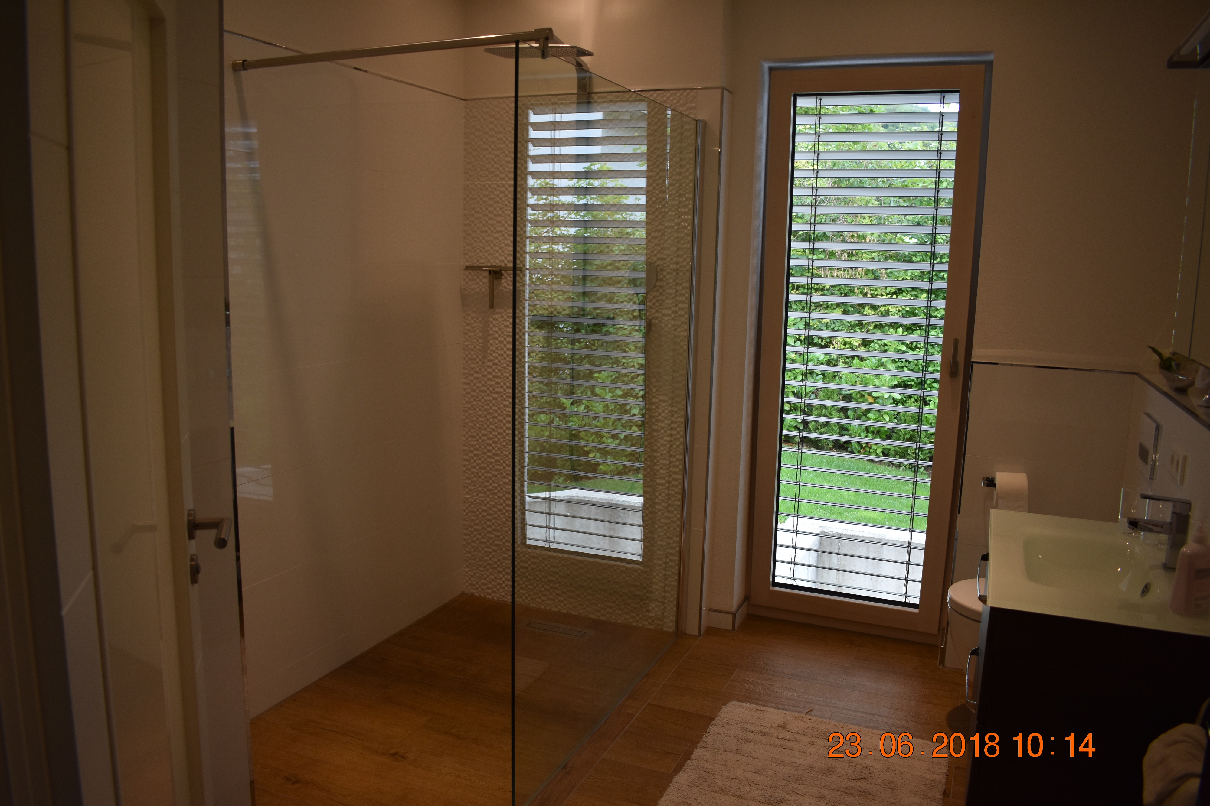 Das Bad mit großem Fenster verfügt über eine sehr weitläufige, bodenebene Regenwalddusche, Waschtisch und Spiegelschrank sowie Föhn, Handtuchtrockner und WC. Handtücher und Bettwäsche ist inklusive. Des Weiteren gibt es im Bad Waschmaschine und Trockner.