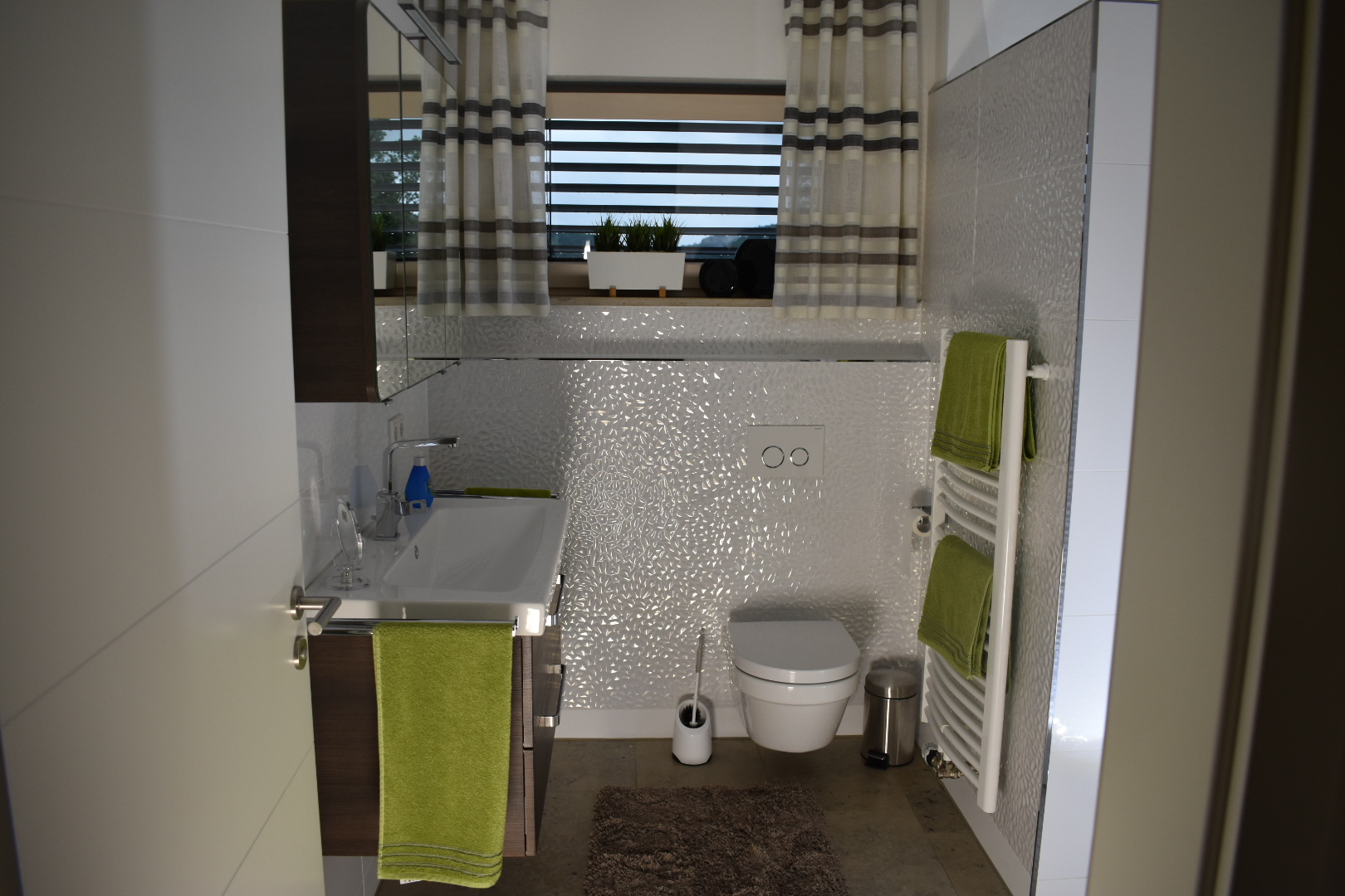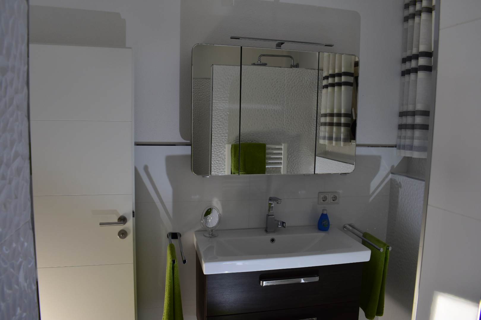 Das Bad mit großem Fenster verfügt über eine komfortable bodenebene Dusche, Waschtisch und Spiegelschrank sowie Föhn, Handtuchtrockner und WC, sowie Waschmaschine und Wäschetrockner. Handtücher und Bettwäsche ist inklusive.