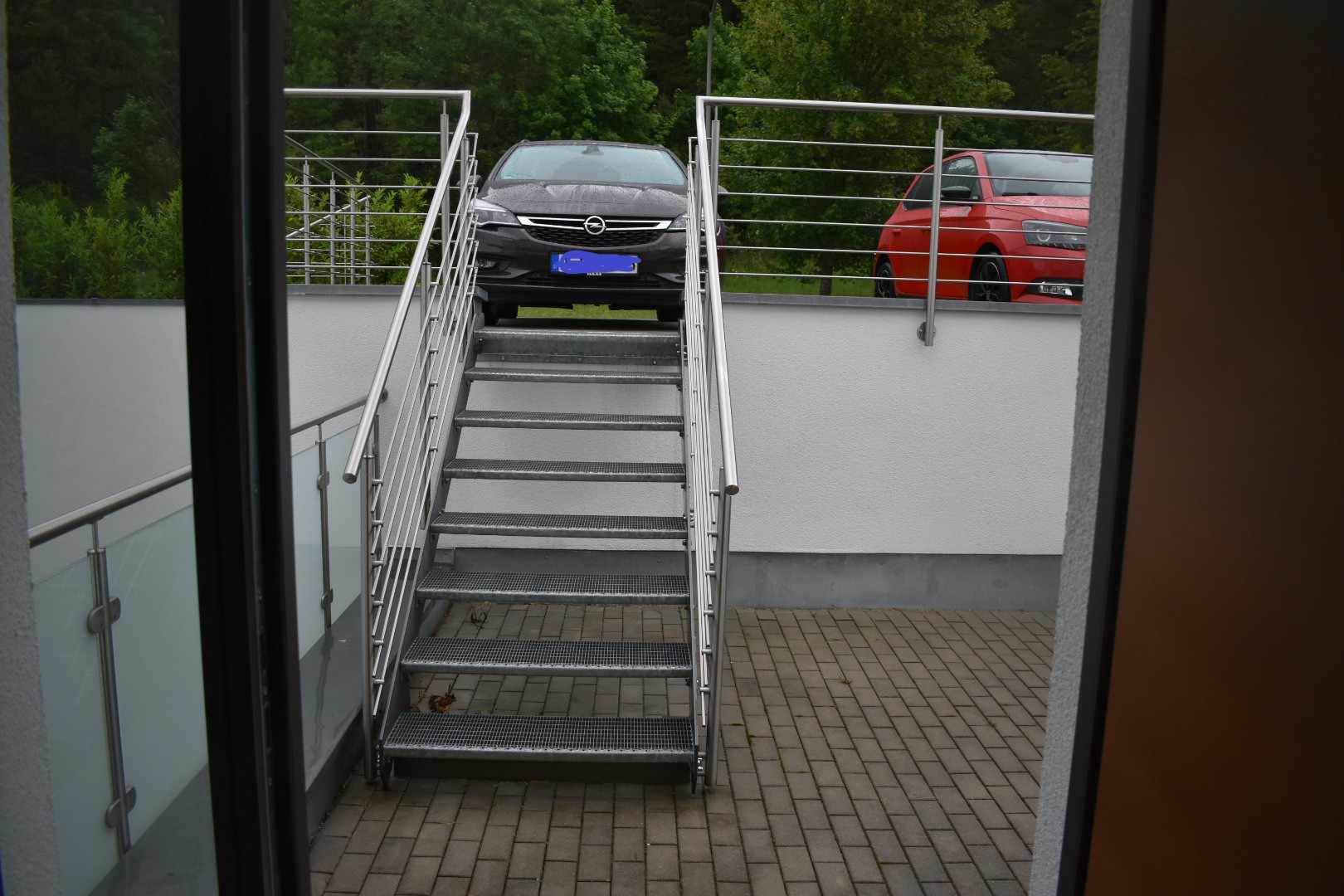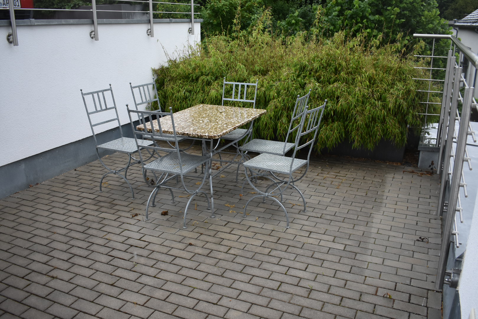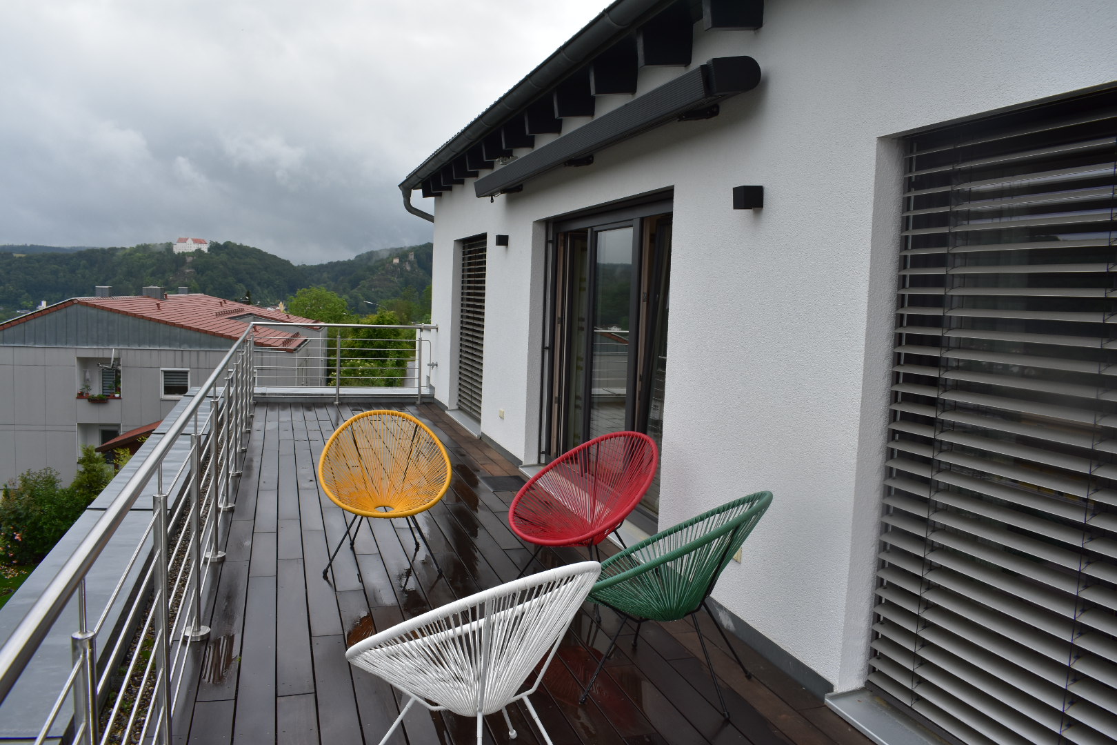 Die Terrasse mit Blick auf Garten, Burgen und den Rain-Main-Donau-Kanal und lässt sich mit einer elektrischen Markise beschatten. Zum relaxen und sonnen finden sie dort zwei Liegen vor und für einen gemütlichen Abend ein Tisch und vier Stühle. Eine zweite Terrasse auf der Ostseite bietet Schatten an heißen Tagen. Direkt vor der Wohnung befindet sich eine separate Parkfläche für zwei PKW`s.