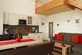 Das 75qm große Ferienhaus bietet Platz für bis zu 5 Personen und ist mit Sat-TV, Radio und WLAN ausgestattet. Das Haus verfügt über 2 Schlafräume mit jeweils 2 Doppelbetten. Ein gemütliches Sofa im Wohnbereich lädt zum Ausruhen ein. In der voll ausgestatteten Küche mit Herd, Backofen, Spülmaschine, Kaffeemaschine, Kühlschrank, Mikrowelle und Toaster findet man alles, was man zum Kochen braucht. Besonders einladend wirkt das Haus durch die offene Galerie und die Verbindung nach außen, auf die große Terrasse. Auf Wunsch sind ein Brötchenservice oder ein gefüllter Kühlschrank möglich.
