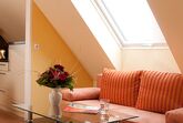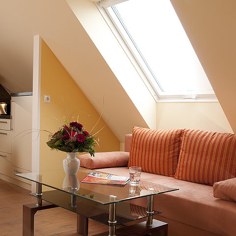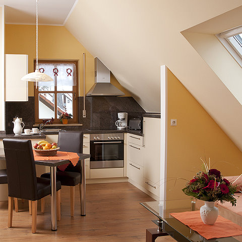 Unsere mit Liebe eingerichtete Ferienwohnung lässt für den Gast keine Wünsche offen. Sie bietet als Nichtraucherwohnung einen erholsamen Urlaub und für den Geschäftsreisenden einen angenehmen Aufenthalt. Die 36 m² große Dachgeschoßwohnung ist mit einem Balkon und Dachfenster mit Rollo`s ausgestattet. Die Wohnung hat ein separates Schlafzimmer mit Doppelbett. Babybett und Hochstuhl kann auf Anfrage zur Verfügung gestellt werden. Im offenen Wohnbereich befindet sich eine voll eingerichtete Küche mit integriertem Essbereich. Eine Schlafcouch steht im Wohnbereich zur Verfügung. Das Bad verfügt über eine Dusche, WC, Waschbecken, Föhn und Handtuchtrockner.