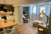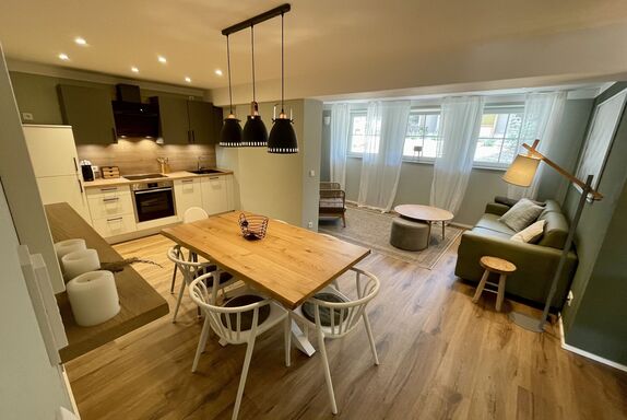 Der offene Wohnbereich mit einer gemütlichen Küchenzeile lädt zum gemeinsamen Verweilen ein. Hier findet ihr ein einladendes Sofa, einen Flachbild-TV und einen Esstisch, an dem ihr gemeinsame Mahlzeiten genießen könnt.