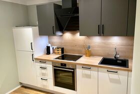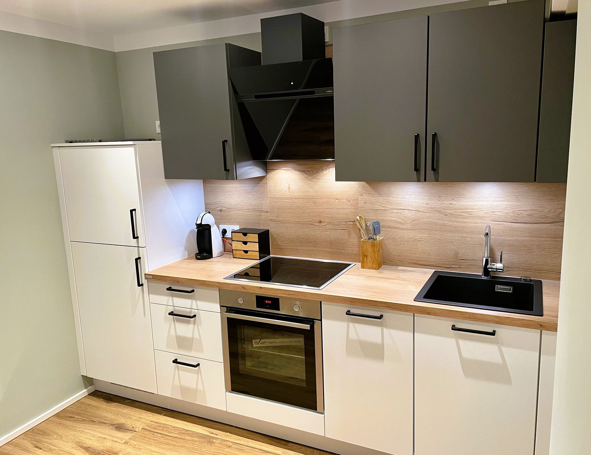 - Eine vollausgestattete Küche mit Backofen, Herd und Spülmaschine