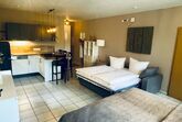 - Ein Wohnbereich mit einem komfortablen Doppelbett (160x210), einer Schlafcouch (140x200) und einem Smart TV