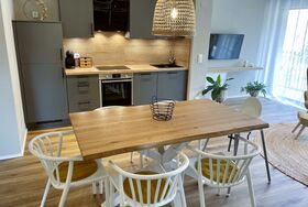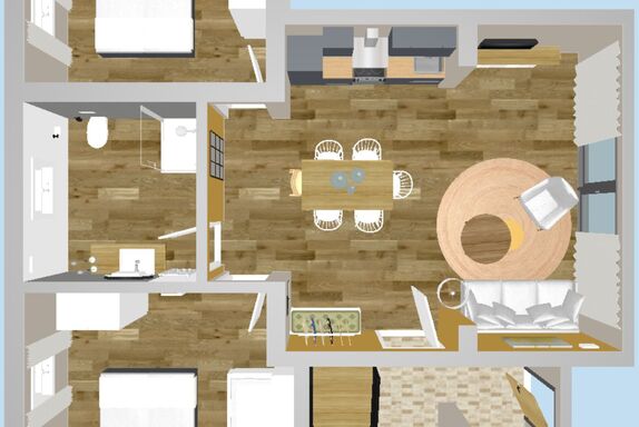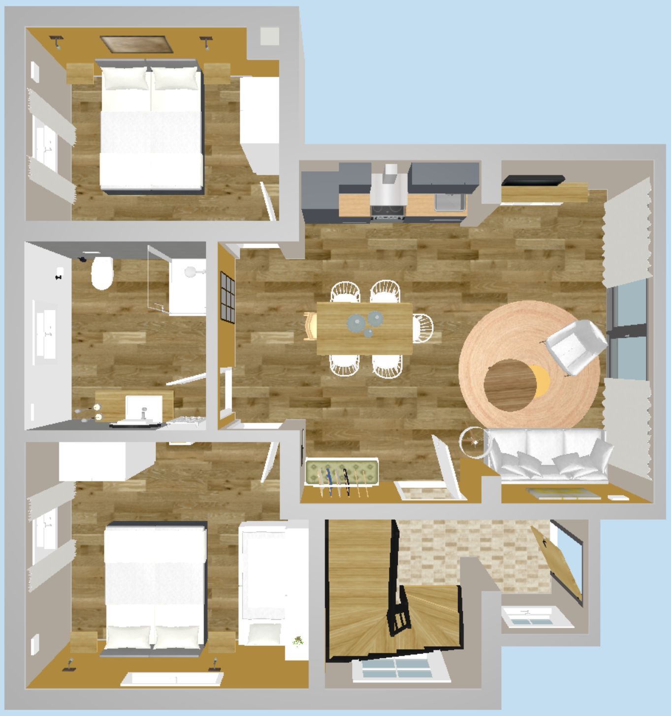 Das geräumige 3-Zimmer-Apartment bietet mit rund 65 m² Platz für bis zu 5 Personen! Auch in der fewo4 erwarten euch unsere komfortablen Boxspringbetten, ein praktisches Schrankbett und ein wunderschöner, lichtdurchfluteter Wohnbereich.