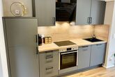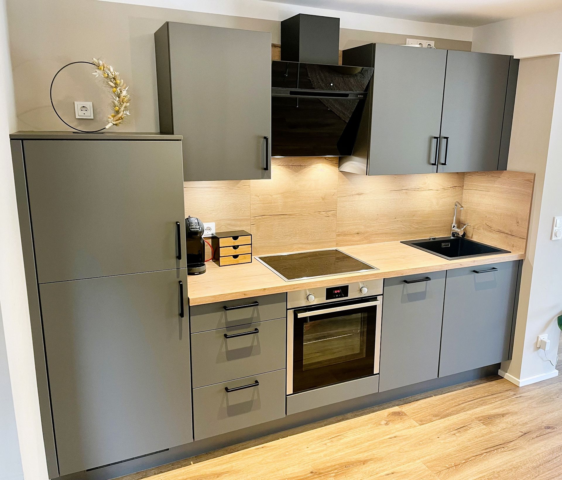 - Eine vollausgestattete Küche mit Backofen, Herd und Spülmaschine
