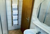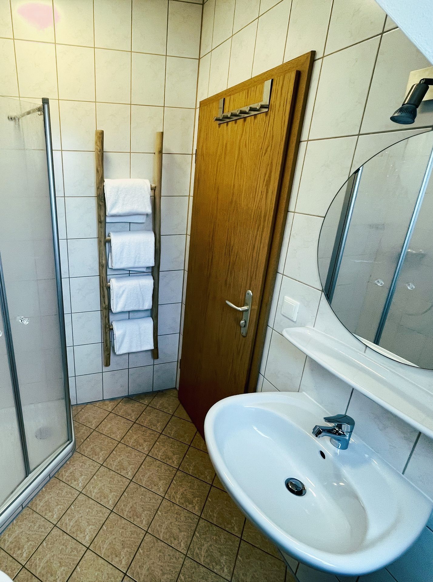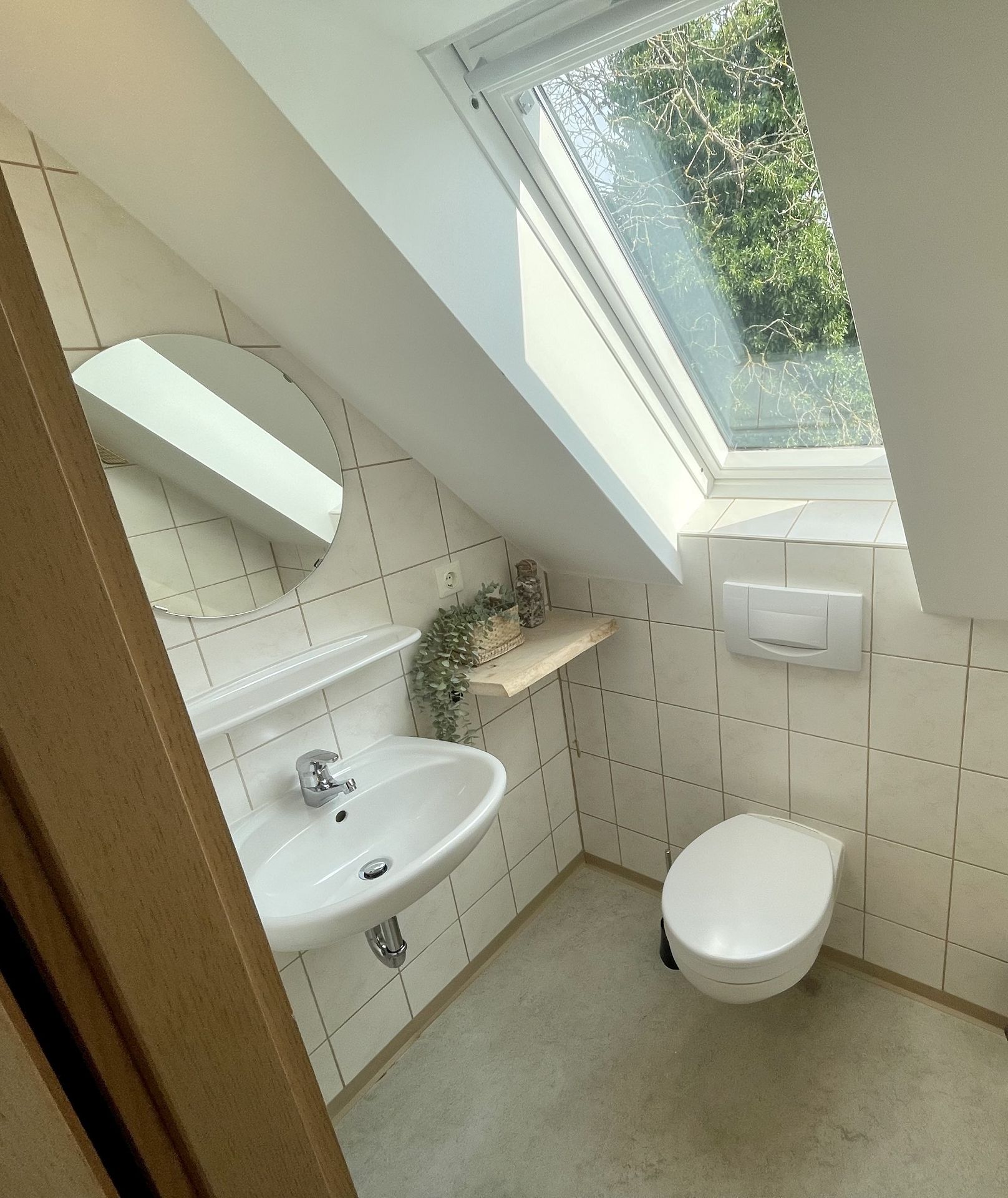 Das Badezimmer bietet eine Eckdusche sowie ein WC.