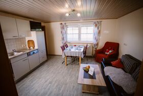Die Ferienwohnung (35 m²) besteht aus einer Wohnküche mit Schlafcouch, Essplatz, Sat-TV und einer kompletten Küchenzeile (Spülmaschine, Wasserkocher, Kühlschrank mit Gefrierfach, Rührgerät, Toaster, Waffeleisen), einem Schlafzimmer mit Doppelbett und Stockbett sowie Dusche/WC.