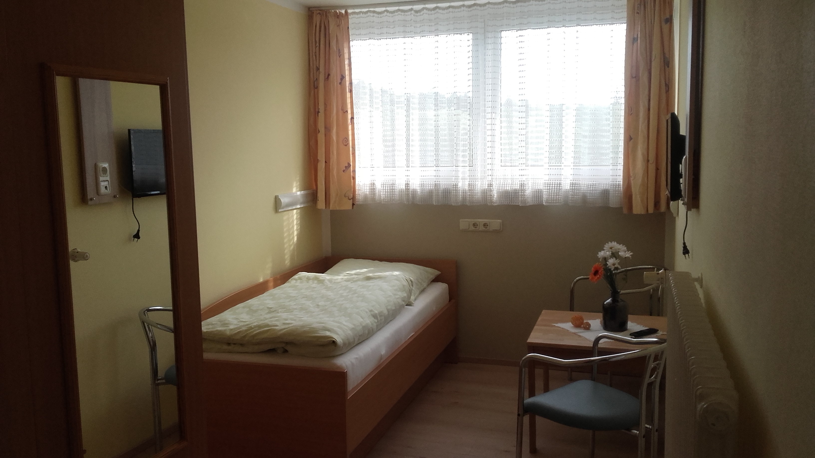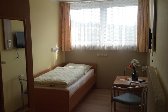 Unser Einzelzimmer verfügt über ein Einzelbett sowie eine Sitzgelegenheit mit Tisch.