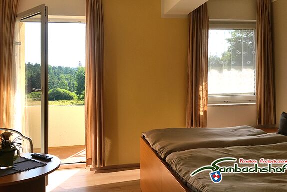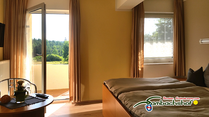 Unser Doppelbettzimmer verfügt über ein großes Doppelbett sowie eine Sitzgelegenheit mit Tisch. Vom Balkon aus hat man einen Blick auf das gegenüberliegende Dammwildgehege. Die LAN sowie W-LAN Verbindung steht kostenfrei zu Ihrer Verfügung. Das Badezimmer verfügt über eine Dusche, WC und ein Handwaschbecken. Zur regulären Ausstattung gehören außerdem Bettwäsche, Handtücher und ein Föhn.