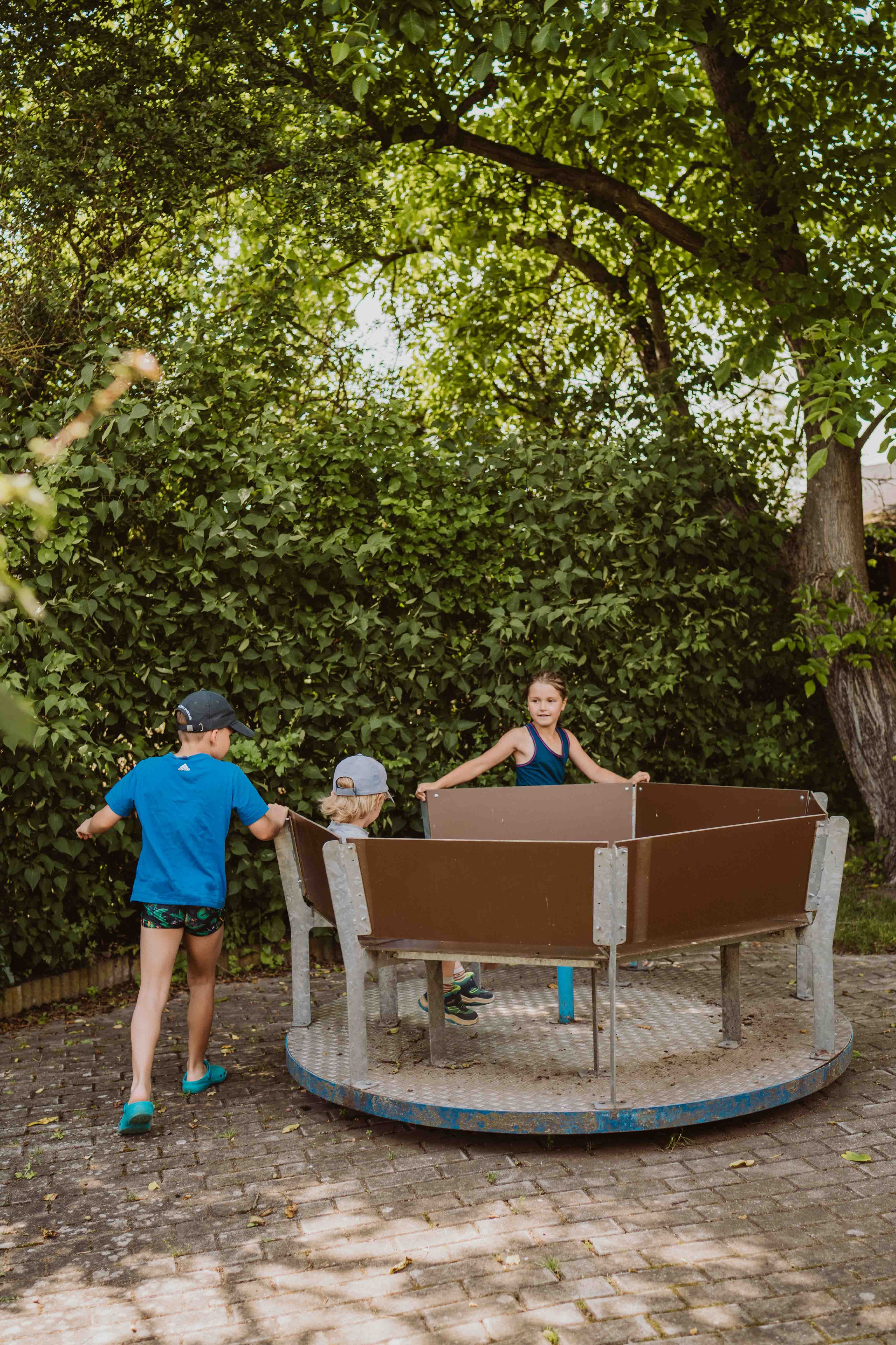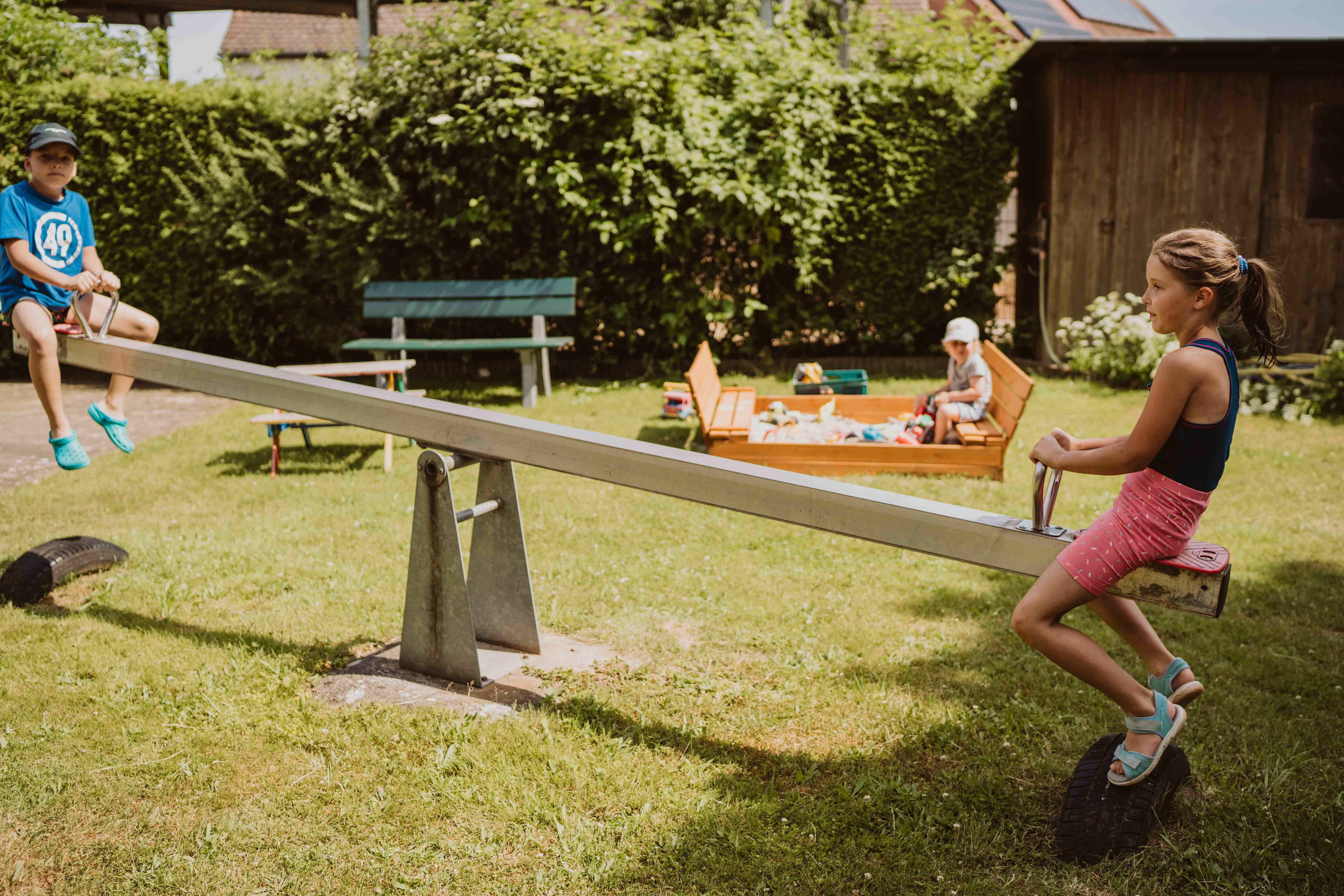 Wippen, Schaukel, Rutsche und Spielhaus sowie Bobby-Car und Tretbulldog stehen bereit.