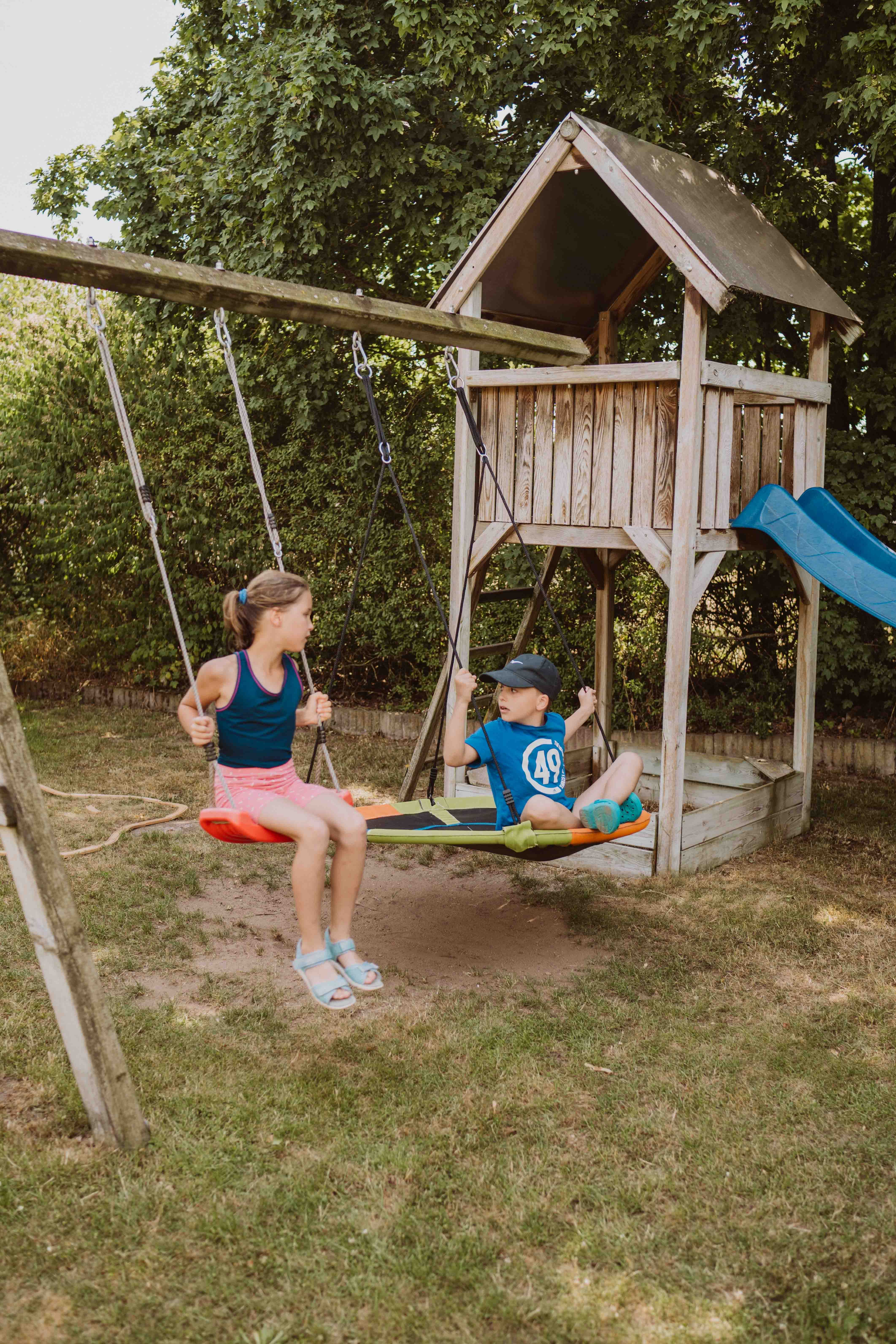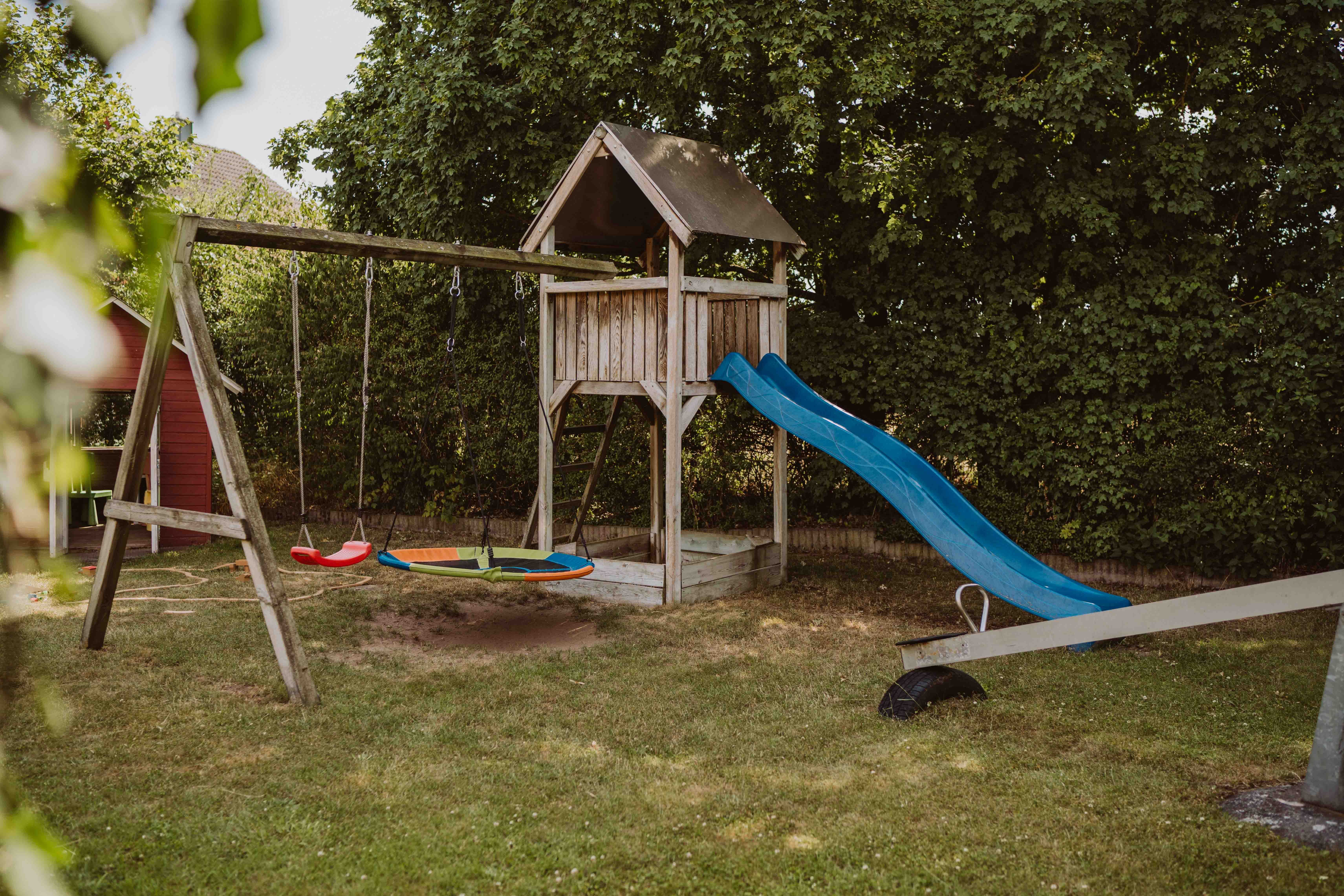 Wippen, Schaukel, Rutsche und Spielhaus sowie Bobby-Car und Tretbulldog stehen bereit.