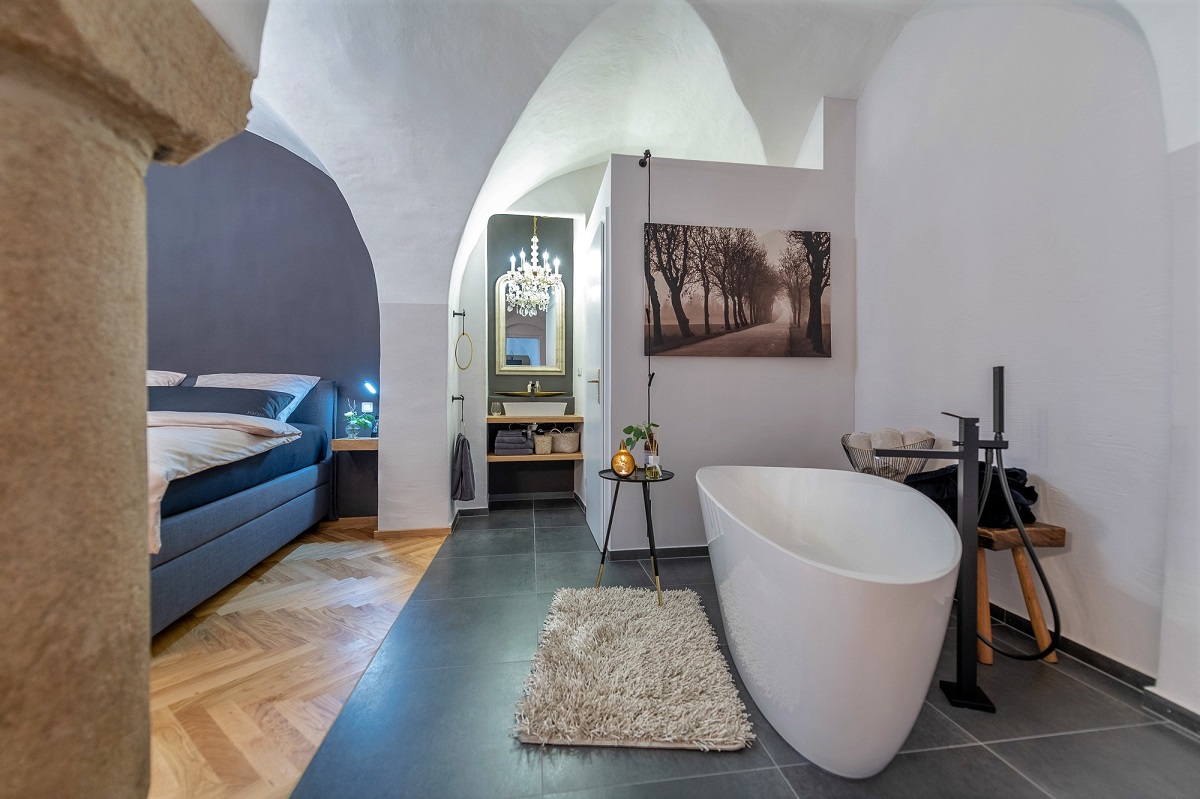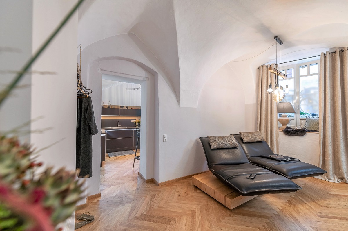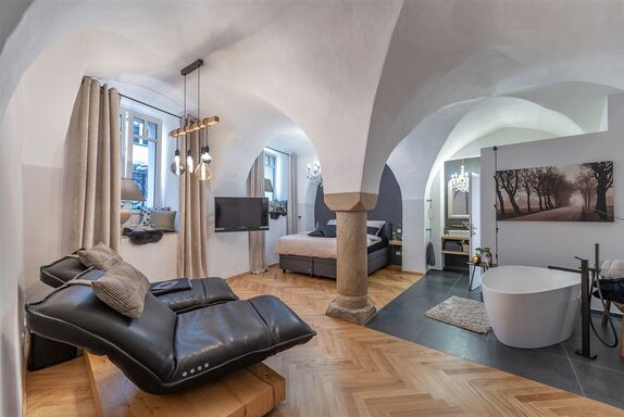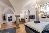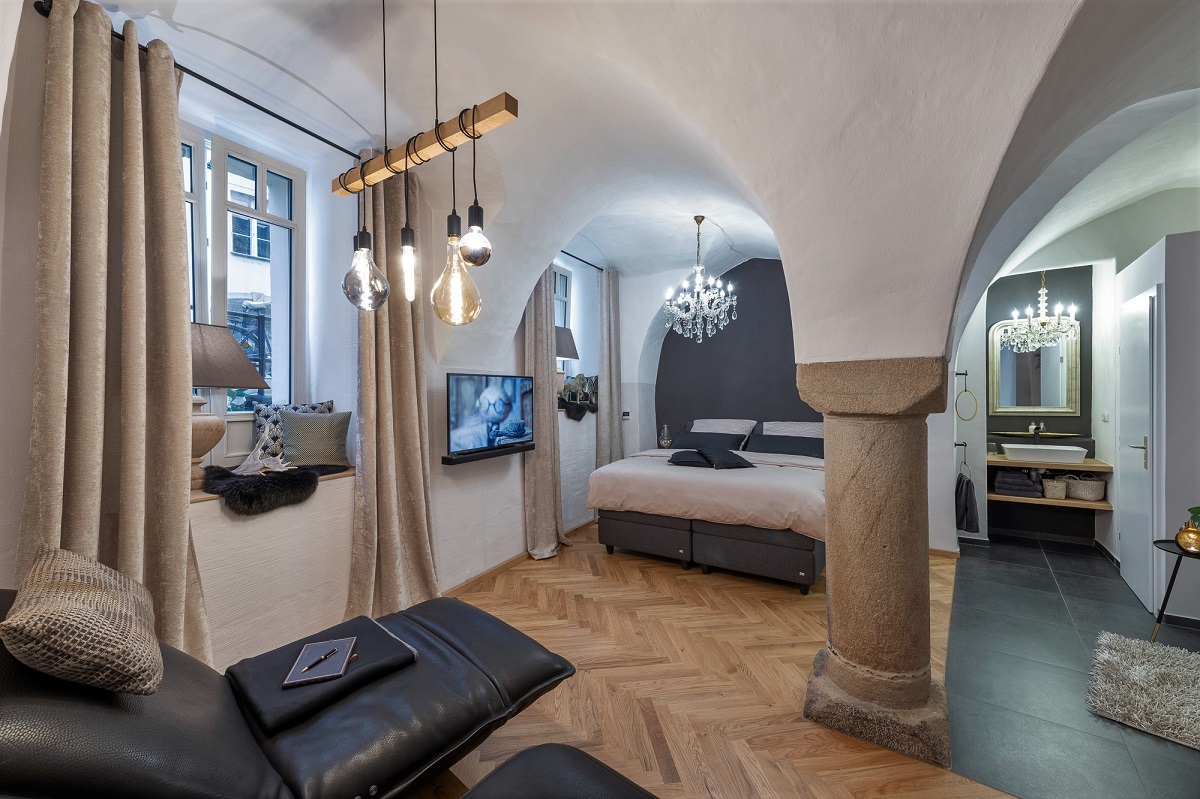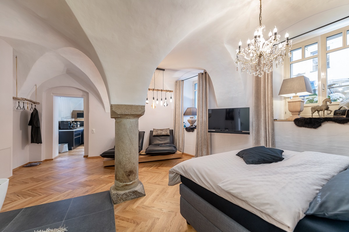 Die Wohnung liegt zentral im Erdgeschoss eines 1370 erbauten Hauses. Eine 650 Jahre alte Granitsäule trägt das Gewölbe und das alte Gemäuer stellt einen feinen Kontrast zur modernen und luxuriösen Ausstattung dar.