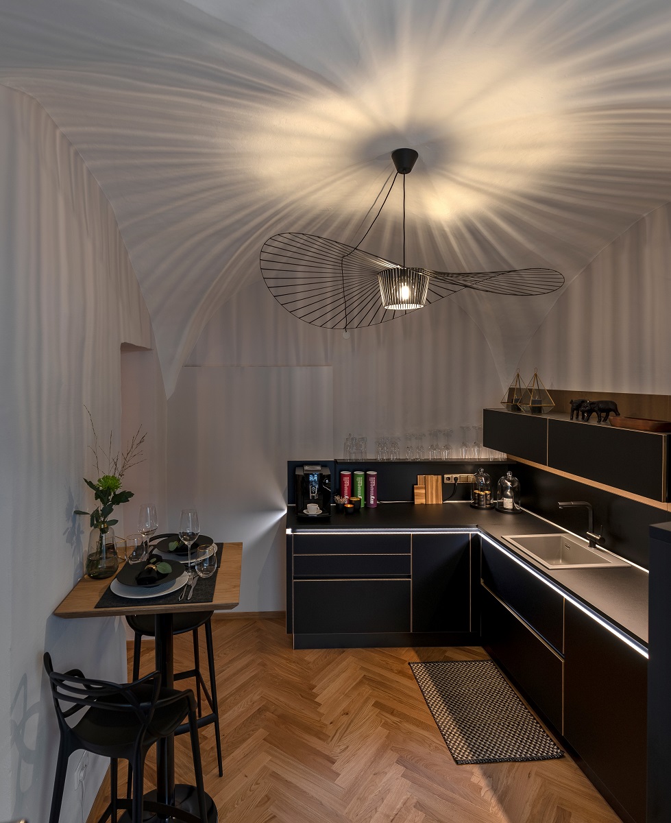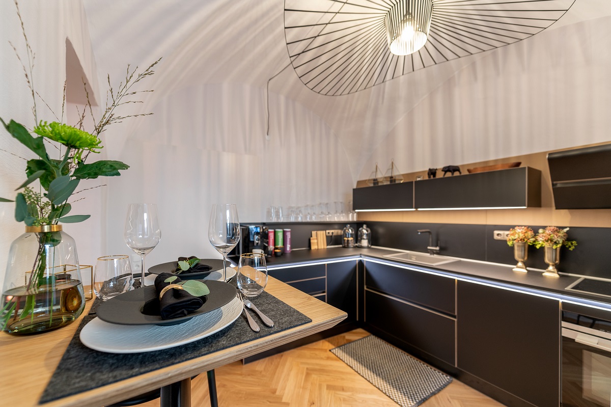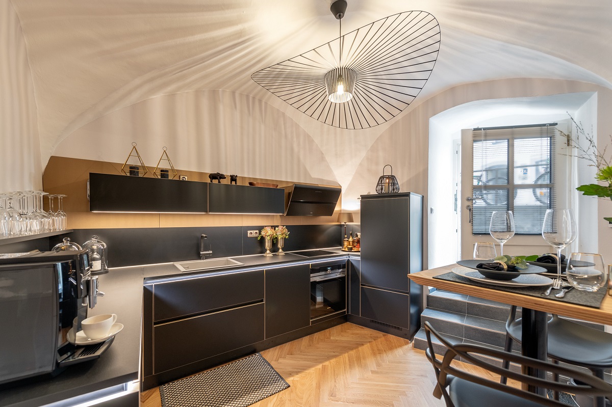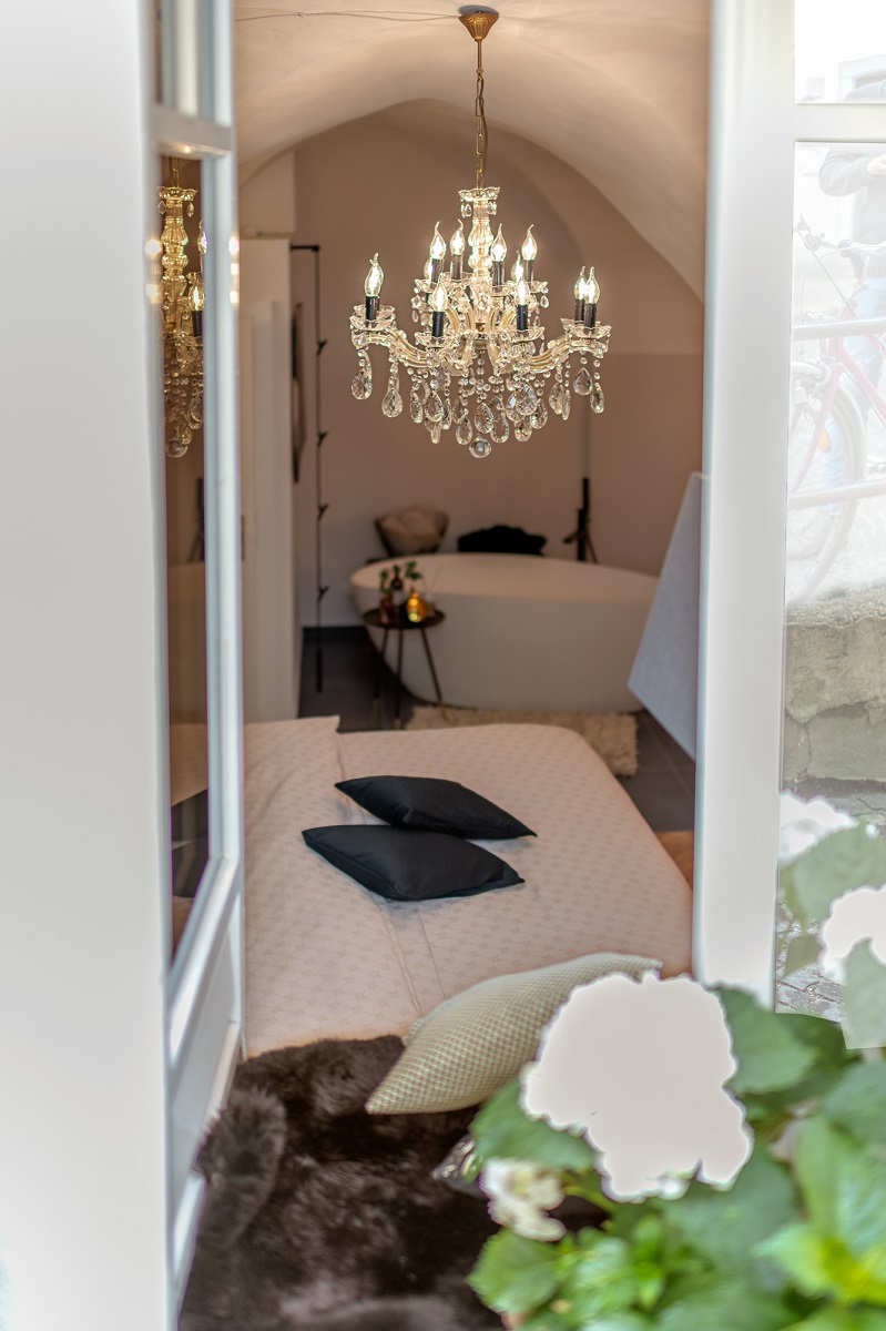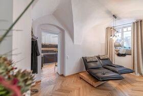 Die Wohnung liegt zentral im Erdgeschoss eines 1370 erbauten Hauses. Eine 650 Jahre alte Granitsäule trägt das Gewölbe und das alte Gemäuer stellt einen feinen Kontrast zur modernen und luxuriösen Ausstattung dar.