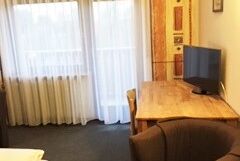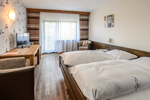 Wir bieten Ihnen ein geräumiges Doppelzimmer, meist mit Balkon zum wunderschönen Garten.