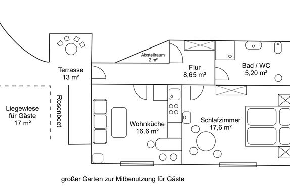 Gehen Sie durch den Garten hinunter zu unserer 35qm großen, mit Schallschutzfenstern ausgestatteten FEWO. Hier lädt eine Sitzecke für den Nachmittagskaffee unter blühenden Rosen ein. Ein Highlight ist die Lage unseres Hauses, nicht nur für Eisenbahnfans! Die FEWO ist gemütlich eingerichtet und ideal zum Entspannen. Und dazu: Mittendrinn und doch ganz nah am Wald und Wiese wo man die schöne Natur genießen kann! Zur Begrüßung erwartet Sie ein Willkommensdrink. Eine Infomappe für einen entspannten Urlaub, mit Tipps für Unternehmungen liegt für Sie bereit.