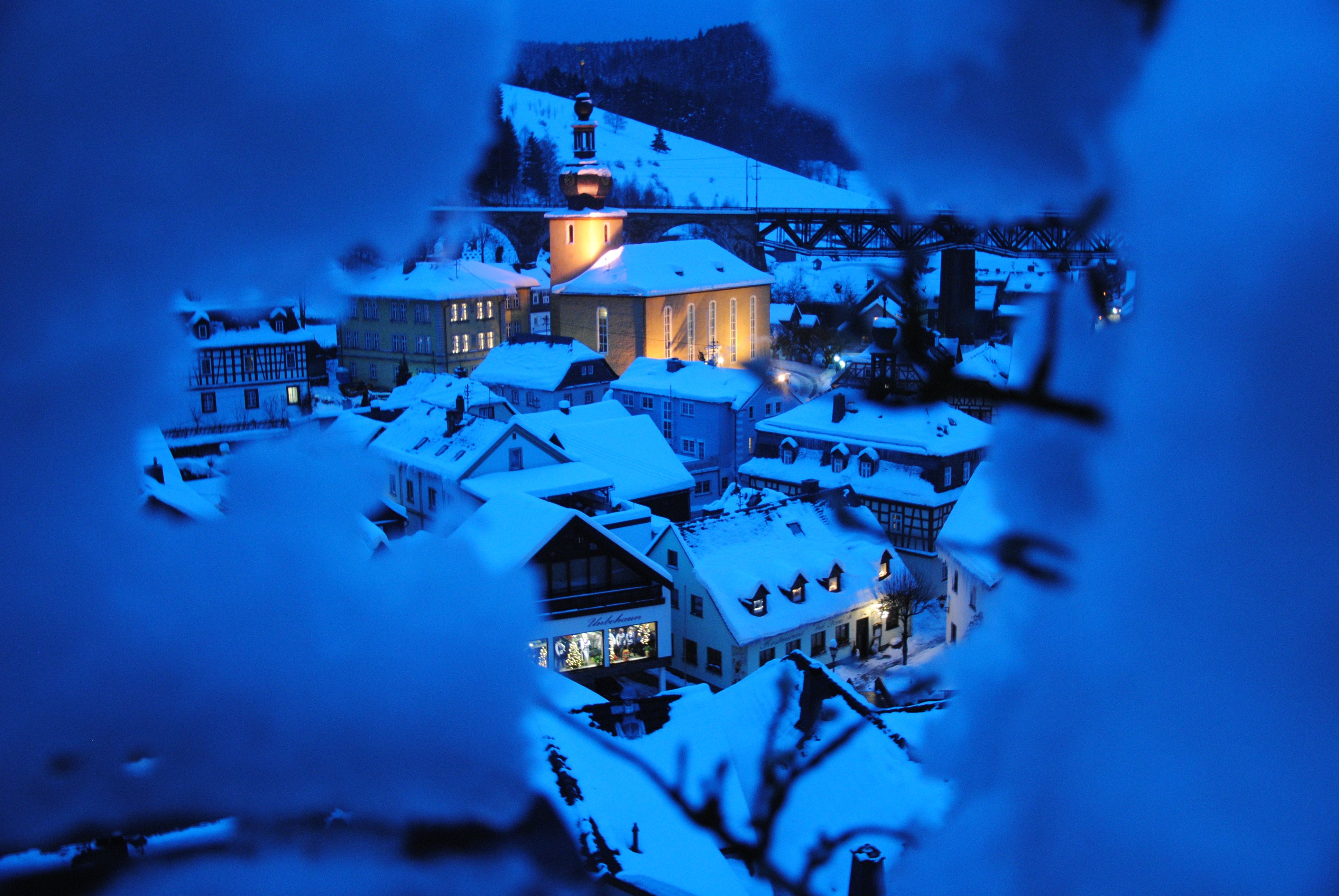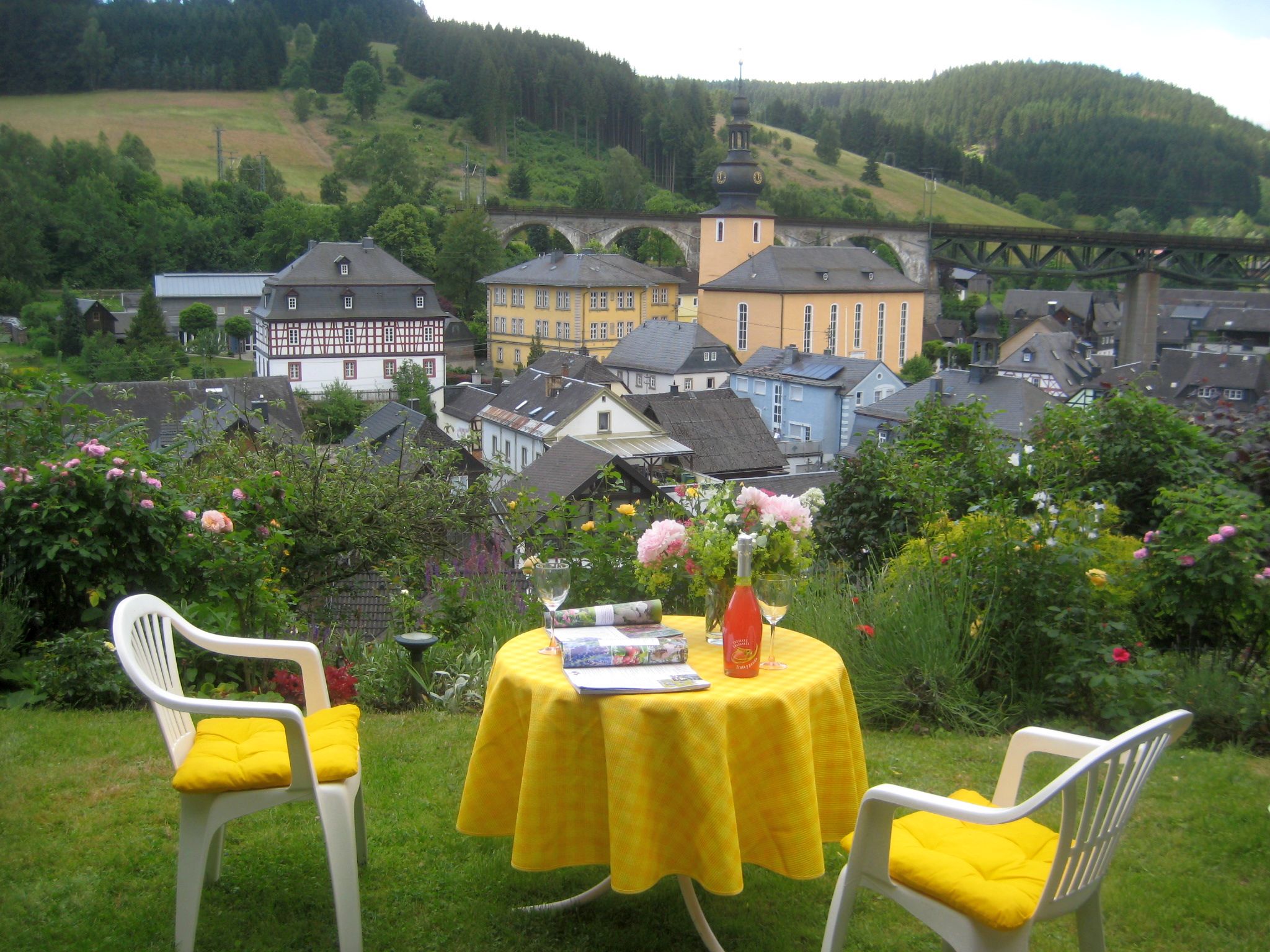 Erst einmal das kleine Städtchen selbst. Es liegt mit Bahnanschluss genau in der Mitte zwischen München und Berlin. In jede Richtung 330 km. Auch in der Mitte zwischen den benachbarten Kreisstädte Kronach und Saalfeld , je 35 km. Die große Eisenbahnbrücke hat eine interessante Geschichte. Sie wurde 1885 erbaut und überbrückt das Trogenbachtal. Wenn man Glück hat, sieht man auf ihr hin und wieder eine Dampflokomotive. Im Winter gibt es ein sehr schönes Farbspiel, wenn sich ein roter Zug vom weißen Schnee abhebt. Viel e Fotos für Magazine wurden von unserem Haus mit dem besten Blick auf die markante Brücke aus gemacht. Auch Fernsehteams nutzen die Lage unseres Hauses für Aufnahmen.