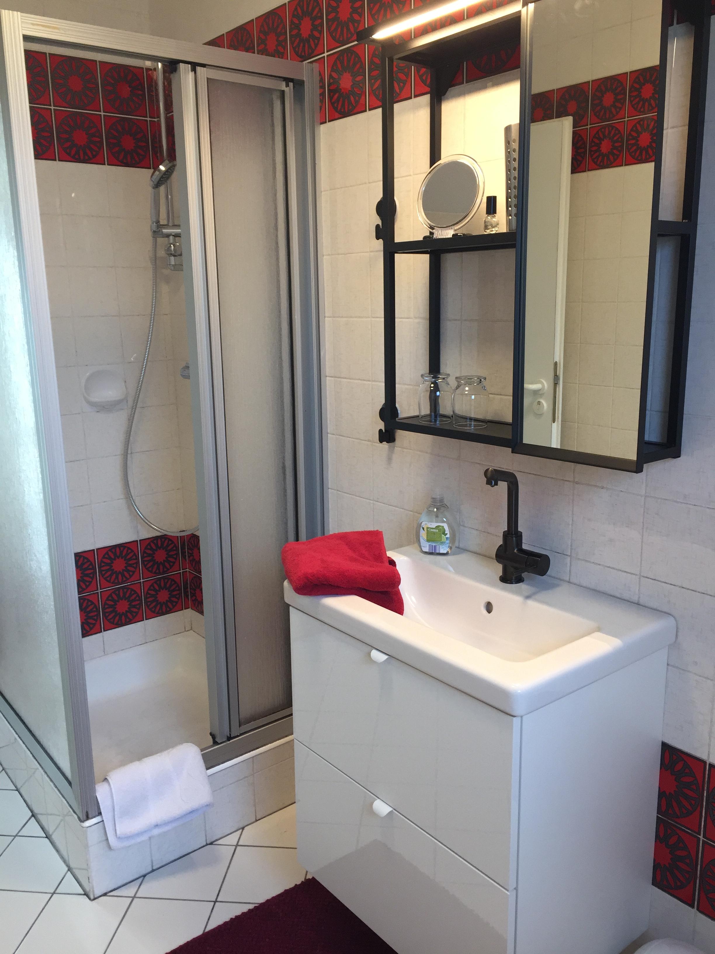 Dusche, Toilette, Waschbecken, Kosmetikspiegel, Fön