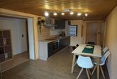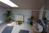 große, hell eingerichtete Wohnküche mit komplett ausgestatteter Küchenzeile und behaglich eingerichteter Mansarden-Wohnbereich
