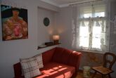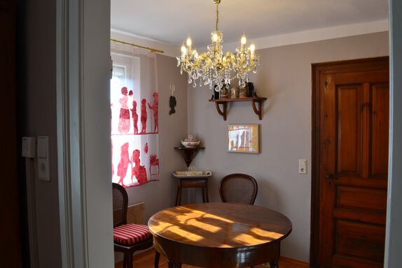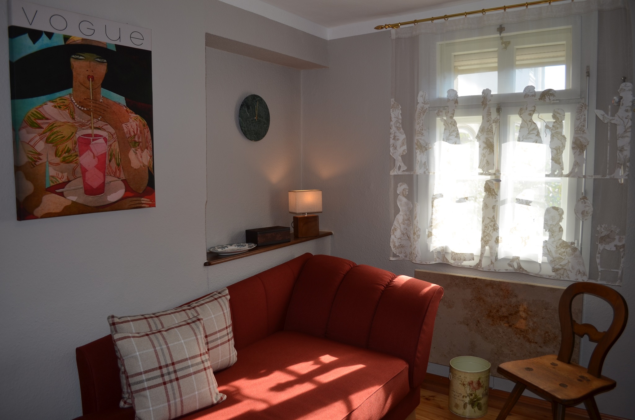 Suite Itzgrund Erdgeschoß rechts: Nichtraucher, keine Haustiere. Reizvoll eingerichtete, schnuckelig verträumte kleine Suite im Haus aus dem 19. Jahrhundert, im dörflichen Ortskern, Schlafzimmer mit zwei Recamieren mit Bettkästen tagsüber behaglich als Sofas, nachts als Betten nutzbar, historisch eingerichtetes Esszimmer. Duschbad im OG separat, mit WC, Waschbecken, Waschmaschine, Fön, Kosmetikspiegel, Bademäntel. Die Wohnung ist außerdem mit einem Ventilator ausgestattet. Vollwertige Landhausküche nebenan im EG(9,5qm), gemeinsam mit Gästen der gegenüberliegenden Suite nutzbar. Größe der Suite 23,5qm, separates Bad 5,3qm.