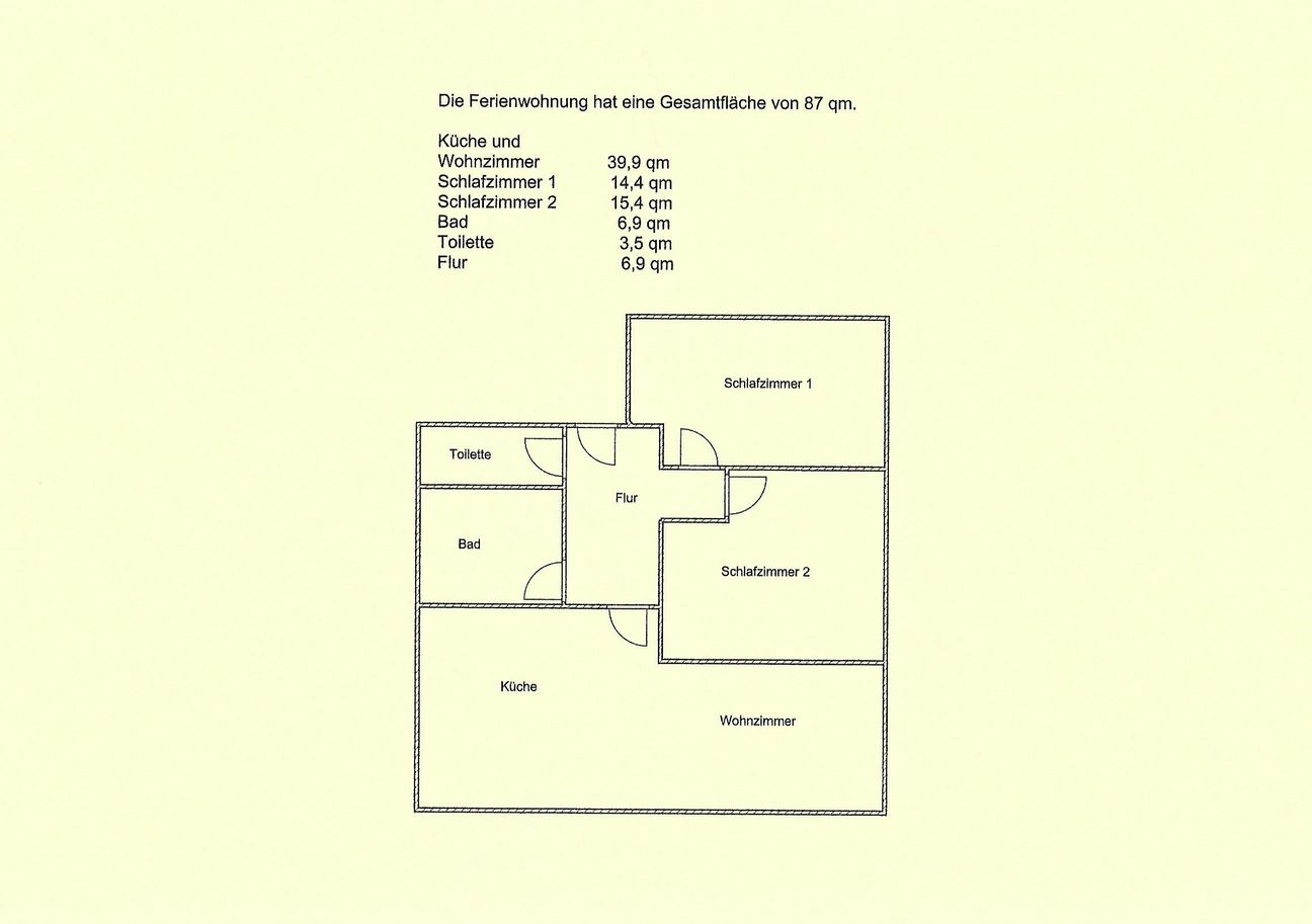Die helle, gut ausgestattete Ferienwohnung bietet mit ihren 87 qm Platz für bis zu vier Personen. Es gibt eine Küche, ein geräumiges Wohnzimmer, 2 Schlafzimmer, Bad und eine separate Toilette.